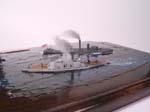 The wooden base was stained, clear coated, and then the blue and dark green of the water was applied with an airbrush. Gel medium was applied for the water effect, and after it had set for half of an hour, the ships were set into it. White acrylic paint for wakes, and then a coat of Future floor polish tinted with a muddy brown was applied over it all.