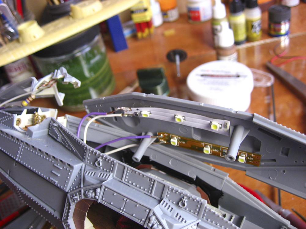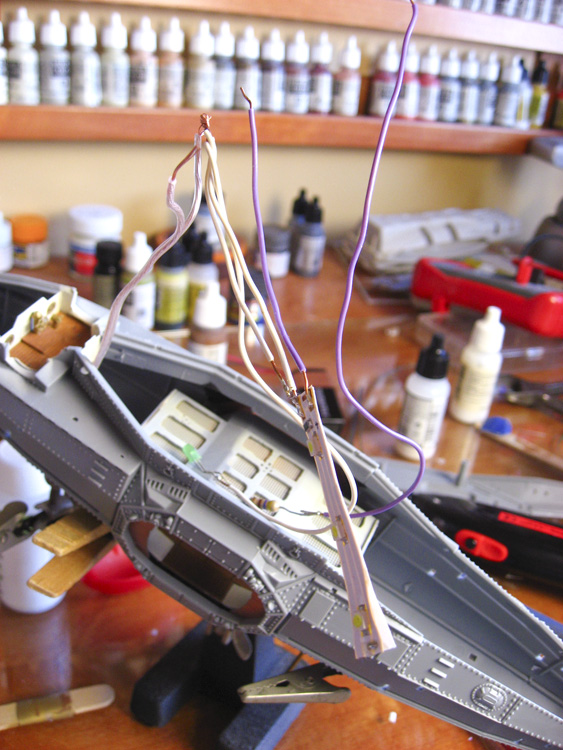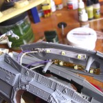 I’ve learned something over the past several days: whatever skill at soldering I once had — gleaned through lessons from my father and repair schools whilst in the Navy — has all been lost. While soldering these simple connections for this model I cursed a lot, burned even more, and even completely cooked an LED from the inside out. I finally got the wiring and lights hooked up and into the model, but it wasn’t a fun process. I either need to practice this skill, or I need to start buying pre-wired lighting kits.