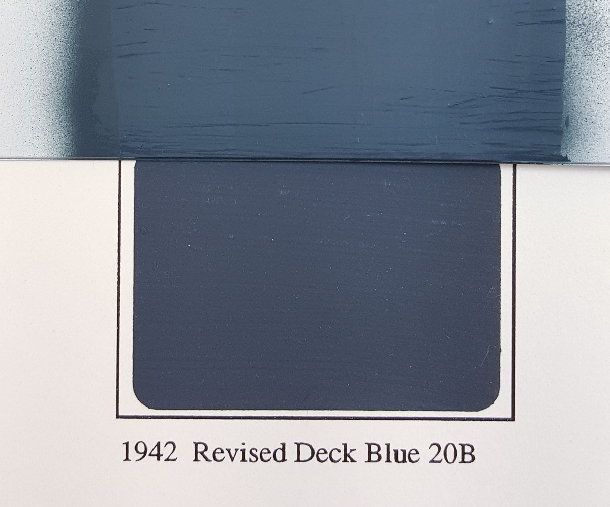 20B Deck Blue (SH-04) – When I first sprayed the 20B, Dan and I thought it a spot-on match for the color chip. After the paint dried fully, however, with the naked eye and in the photo below one can tell there’s a bit of a difference between the paint and the S&S sample for 1942 Revised Deck Blue 20B (it’s way off from the 1941 20B). In both the photo and actual observation, the paint appears to have more of a green tint, whereas the S&S sample is stronger in the blue range. It’s definitely close, though, and again, with weathering and scale effect taken into consideration and not having an S&S paint chip right next to it, it should pass just fine on your model.