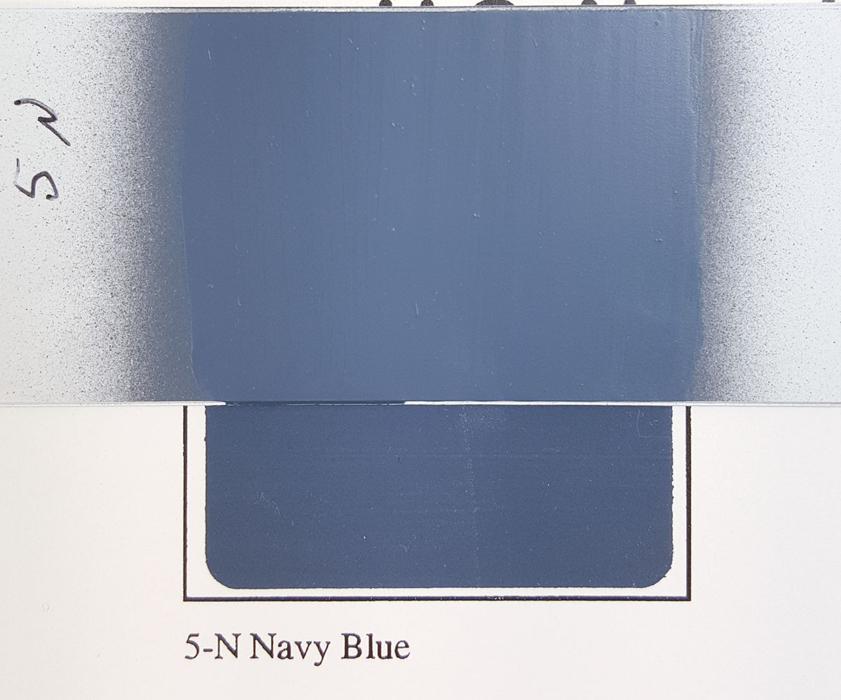 5-N Navy Blue (SH-08) – in the photo below there’s a bit of difference in the paint sample and the S&S chip. In person the difference is negligible, and mostly due to a slight gloss finish on the paint as I applied it on the heavy side. It’s not perfect, but so close that you won’t notice unless you have the S&S chip right next to it. If you compensate for scale effect or apply weathering, it’ll do just fine.