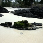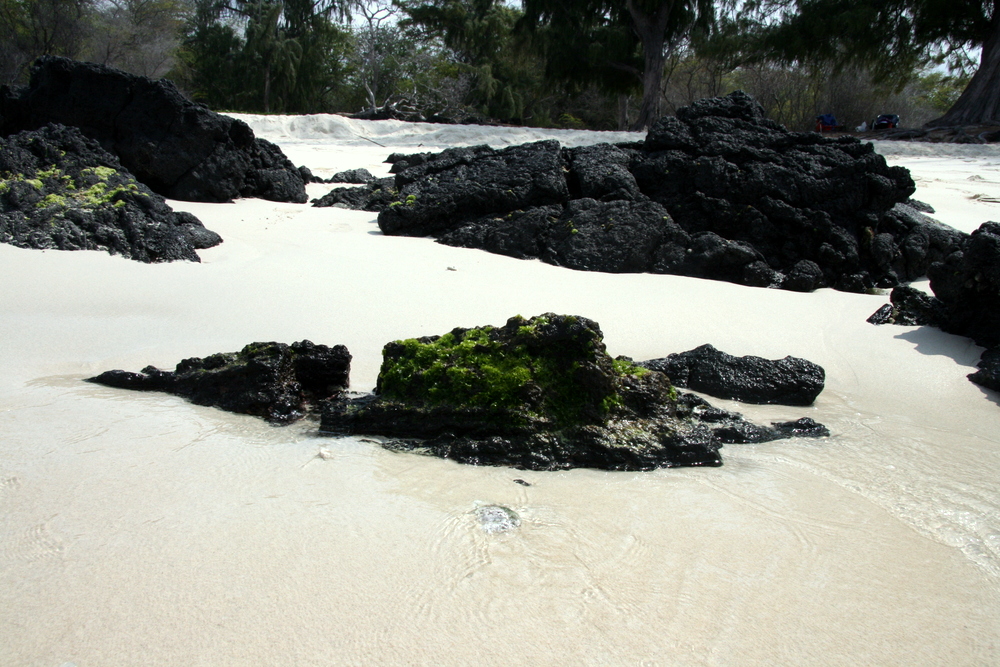 Last Friday we went to Makalawana beach here on the big island. This secluded spot is almost universally reported to be one of the best beaches on the island, if not one of the best in the world. The trick is in getting there. One must first drive a park “road”, which is an indistinctly paved path through a lava field. In certain places the asphalt undulates with the shape of the lava rocks just under it, and in other places the asphalt just gives up and you’re driving on lava that has been broken down to gravel. It took us about 30 minutes to drive that one mile in a Mustang rental car. Once you park, then you get to the rough terrain. You walk a good 3/4 of a mile to a full mile through a lava field in a vaguely market foot path. Add no shade and the coasts’ 80+ degree temperatures, and you’re in for a treat!
