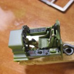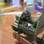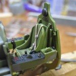 The cockpit went together really fast. The only issue I had was that I skipped priming everything to save time, and I’m using acrylic paints, so when I masked off for the black consoles, removing the tape pulled up some of the green paint and I had to retouch. The seat harnesses are leftovers from a photo etched set I bought years ago. I did a quick wash of black and brown oil paints cut with lighter fluid, so it would dry fast, and it looks okay, but I’m not thrilled with the grain of the paint and I’ll be looking for something that will dry with a less coarse texture.