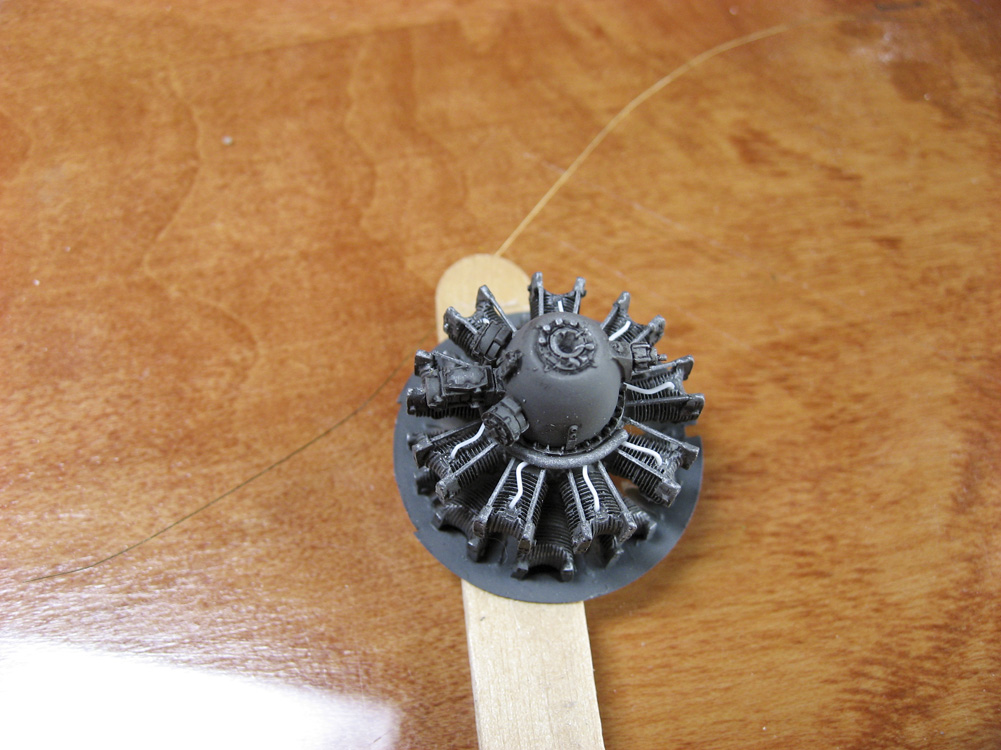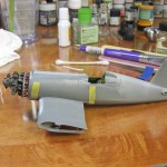 As of today I’ve finished the engine, which is a Quickboost resin aftermarket upgrade that I found in the kit box — I must have bought it at the same time I did the model — to which I added push rods, a wiring harness, and spark-plug wires (the as-yet unpainted white items). The last photo I shot fifteen minutes ago. The engine is not yet glued on, and the tape is holding on the lower wing assembly as it dries, but the fuselage is all glued together, and filling and sanding of some small gaps done. By this time next week I hope to have it all together and primed, ready for paint. My goal is to have this be a “less than three week” model.