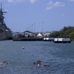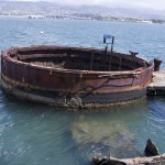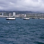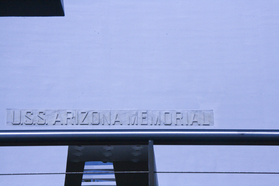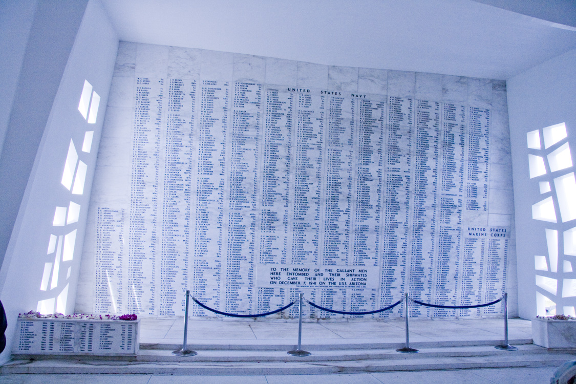 The boat ride out to the memorial was filled to capacity. You pull up to the long white structure, barely aware of the destroyed hull of Arizona just barely under the water’s surface. The memorial itself is large and hollow and crowded with tourists. At the memorial’s sides, wide-open to the outside world, you look down into the gentle waves and see the hull of Arizona still sitting there, rusting and clearly visible, seeping oil into the harbor. Parts of the ship stick up out of the water, shades of brown and green, coated in marine growth, an enormous metal tomb just below your feet. Etched in the marble wall the far end of the memorial are the names of the 1,177 who died there, and those who’ve been buried there since.