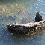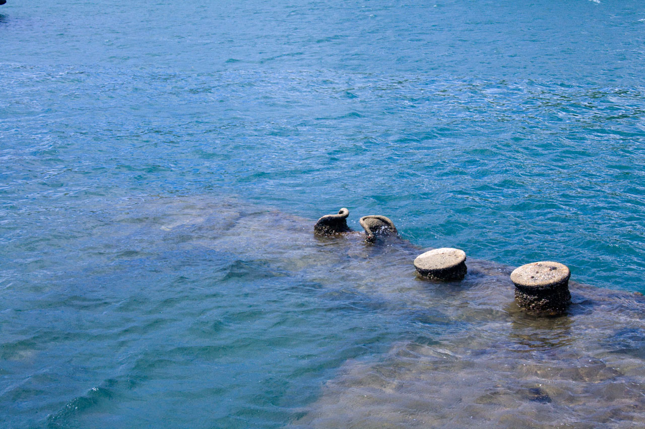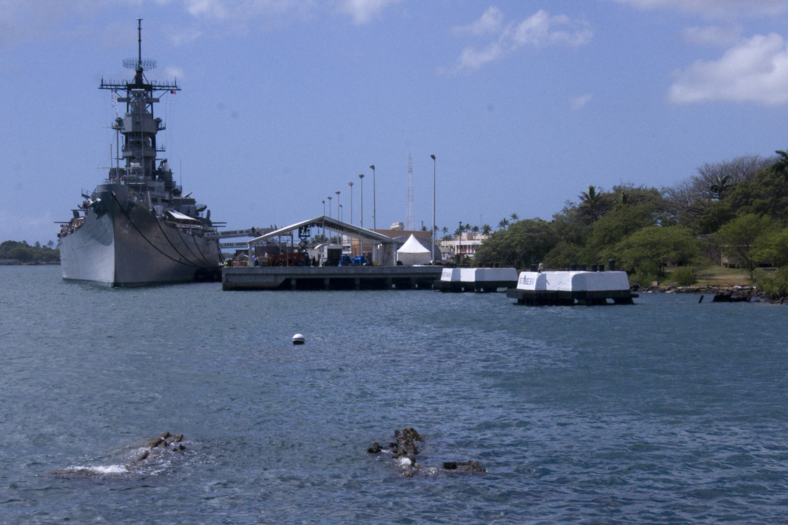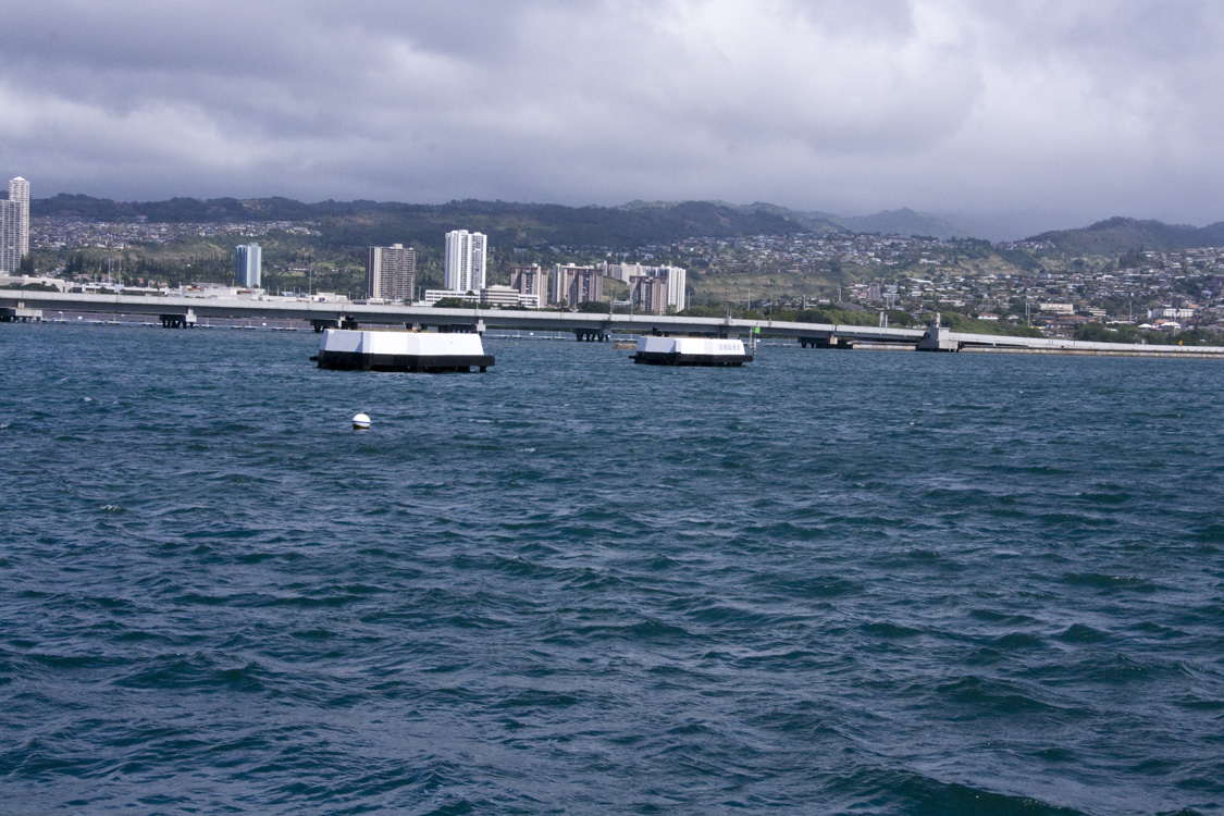 Many things struck me while on the memorial, such as how small Pearl Harbor truly is, and the mooring quays marked with the names of the other battleships in their location during the attack. But one of the most fascinating aspects is the leaking oil. I’d been under the impression that a drop of oil made its way to the surface every few minutes or so, but as I stood there I could easily see multiple drops float upward and burst on the surface every few seconds. I watched for a long time, mesmerized, as the blobs spread out into shimmering greasy rainbows on the surface, undulating on the slight waves of the harbor.