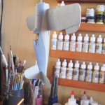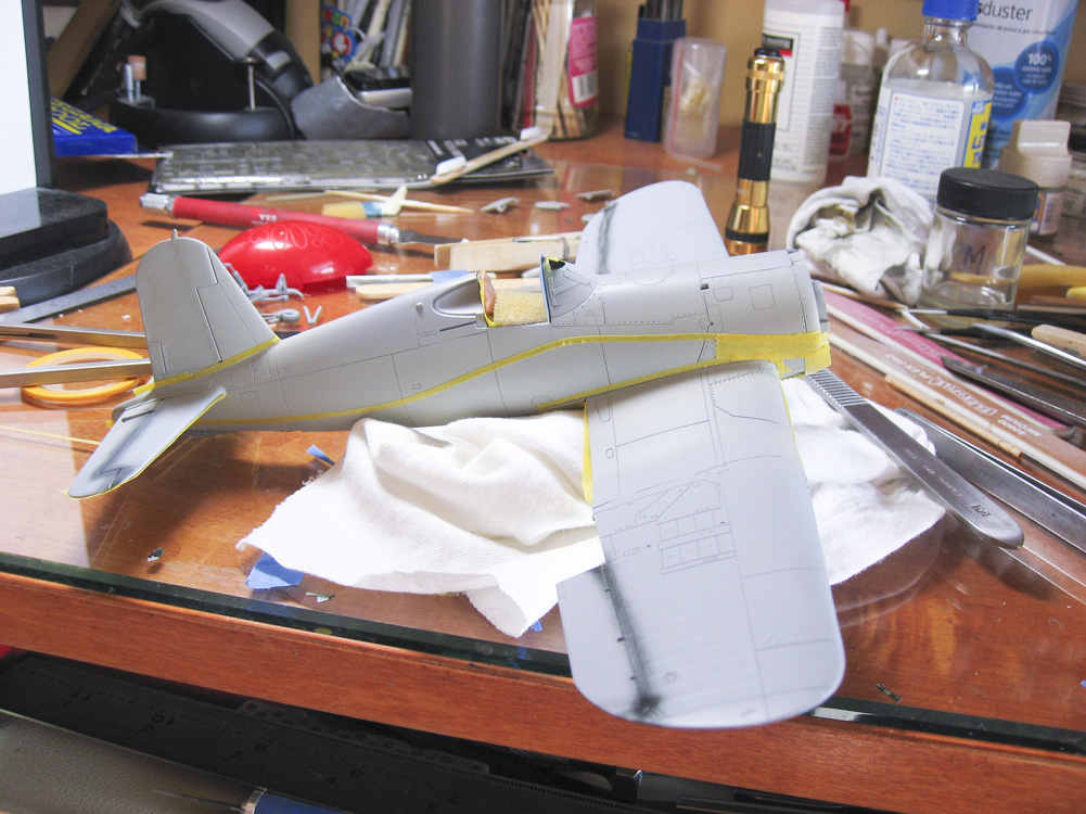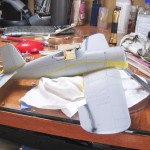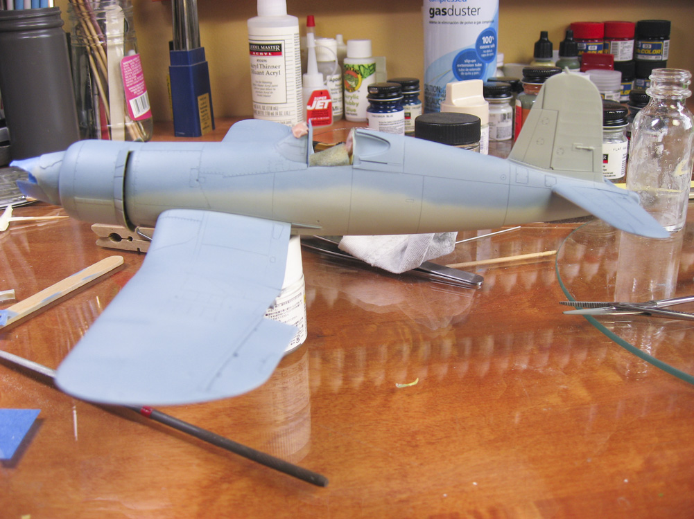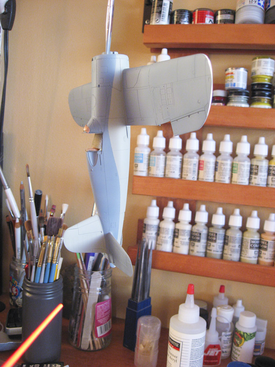 “Marine’s Dream” has an odd demarcation between the Blue Gray and the Gray. Normally the Gray wouldn’t come up so high on the fuselage, but it does on this bird. I initially laid out the demarcation between the colors with tape. After spraying it and removing the tape, I gave it a light sanding to knock off the edge from the masking tape, and then went in and did the demarcation line free-hand, using my Sotar 20/20 airbrush, ultra-thinned paint, and very low air pressure. I had to go back and fourth between the two colors maybe four times to get it all looking right, but I’m happy with the results.