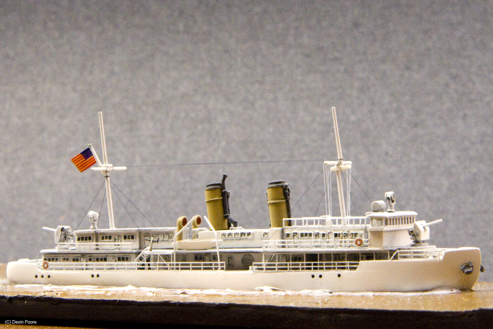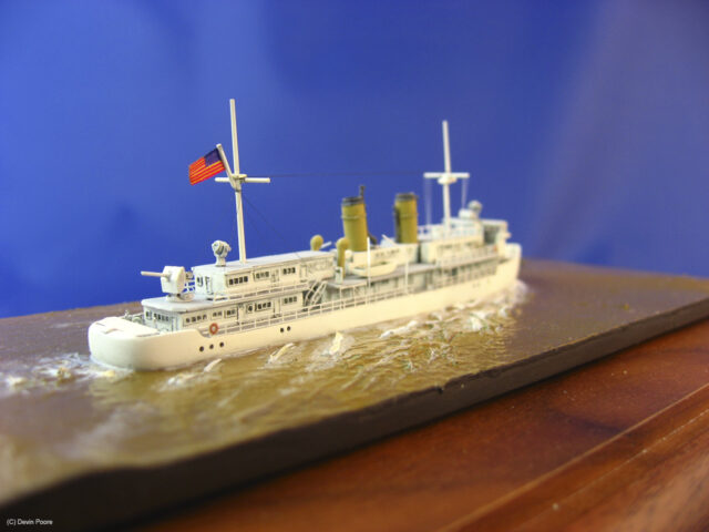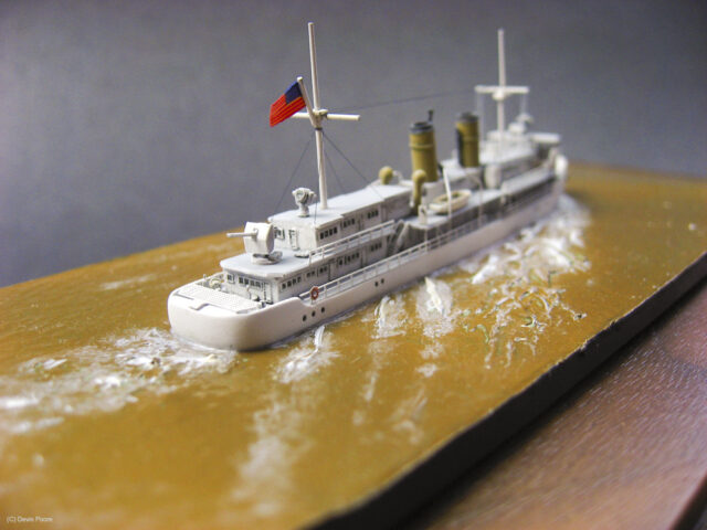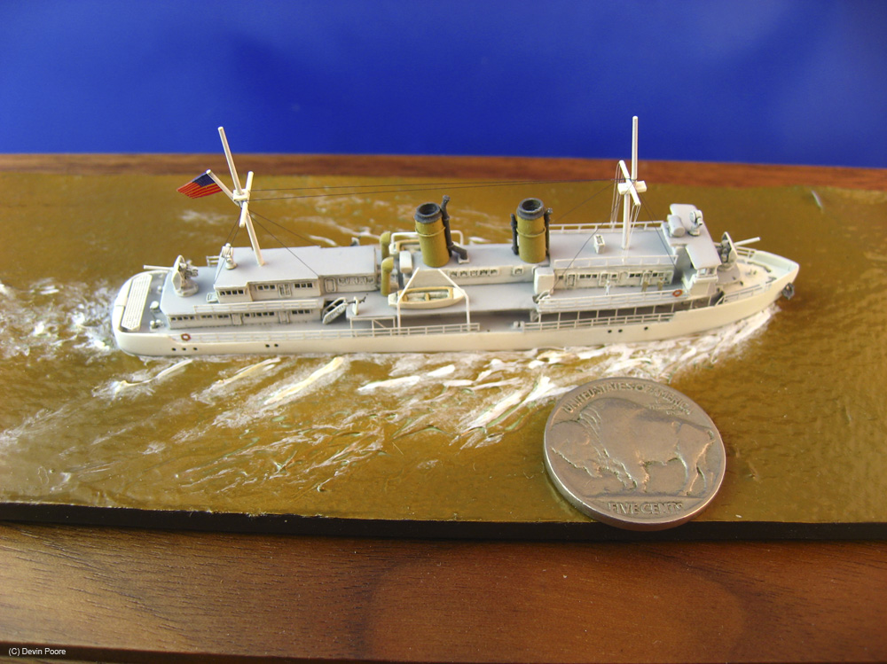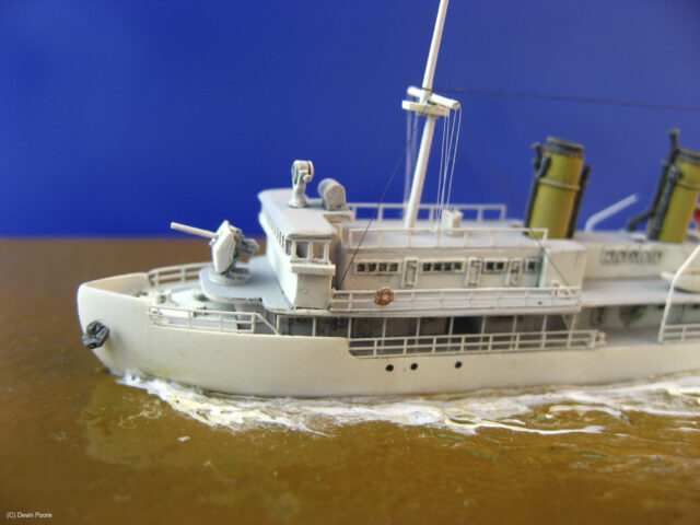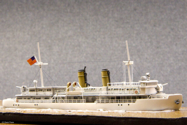 Kit-included PE is very nice, especially the gun shields that one folds to a three-dimensional final product. I had problems with the thinness of the bridge windows, so replaced them with 1/350th scale ship’s ladder from the spares box. I rigged the model with fly-fishing line. I didn’t have a full rigging diagram for the ship, and photos vary depending on when they were taken, so I put in the basic mast stays, lines for flags, and kept it at that.