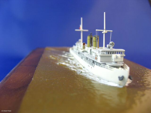 This kit is tiny, just over 3″ long when completed. The build went fairly smoothly, the only issues were roughness on the decks that needed multiple passes of filler and sanding to smooth out, and a tendency for the paint not to stick to the resin during masking, despite multiple cleanings with everything from hot water to lacquer thinner. I mostly got around the paint issues by free-handing most of the details, and leaving off things such as black stripes on the side of the hull that couldn’t be done without masking.