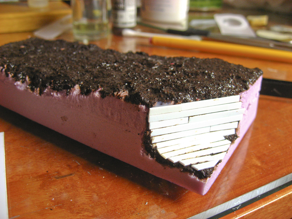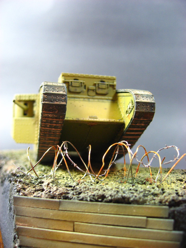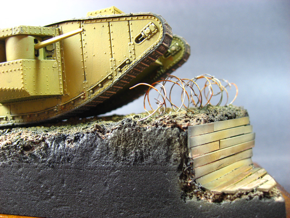 The display base is a chunk of pink insulating foam rough carved to shape with a wire brush, mounted on a rectangle of poplar. The wood reinforcements for the trench are white styrene, and the barbed wire is part coiled picture hanging wire, and a coil of steel wire with individual barbs of wire added. The ground work and mud are old coffee grounds, mixed with water and white glue to make a paste. Various earth shades were then used, mixed and misted over each other. Testors dullcoat lacquer, decanted from a rattle can, was then used to give it all a uniform flat finish.
