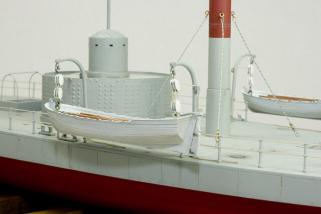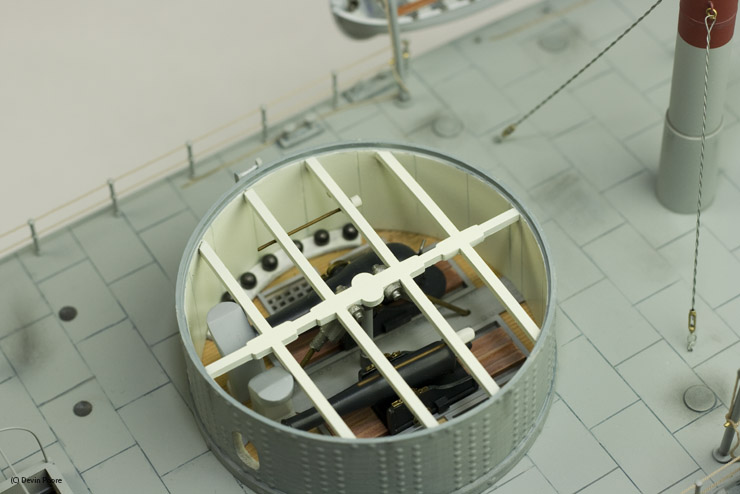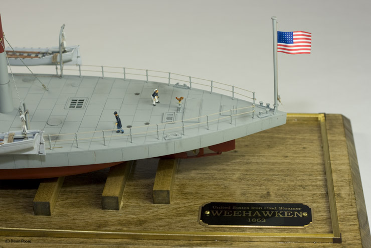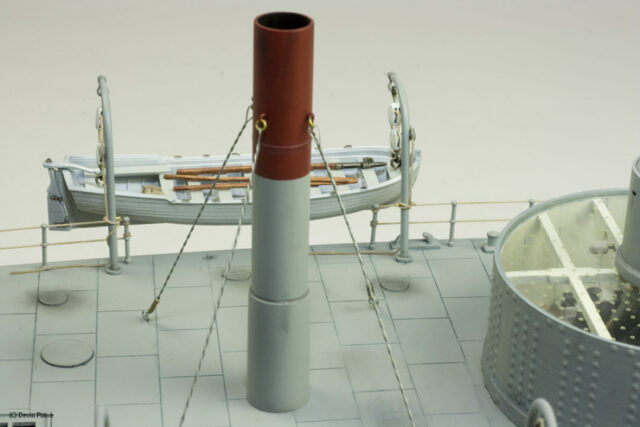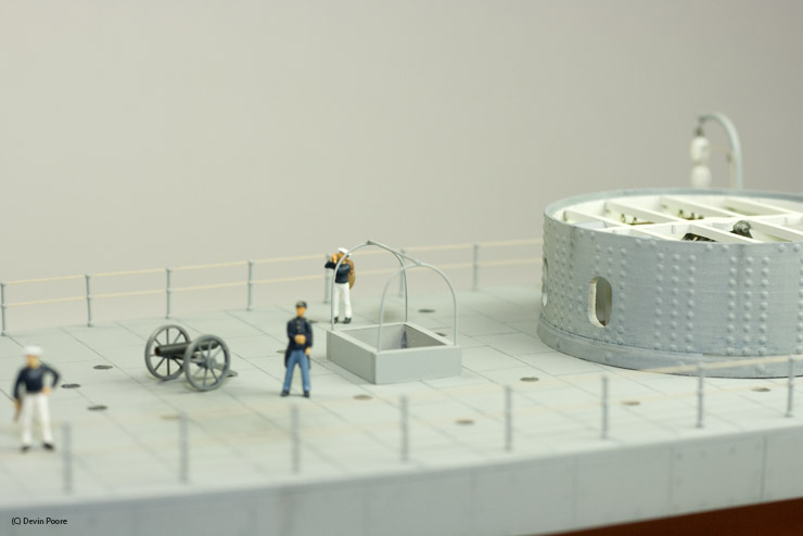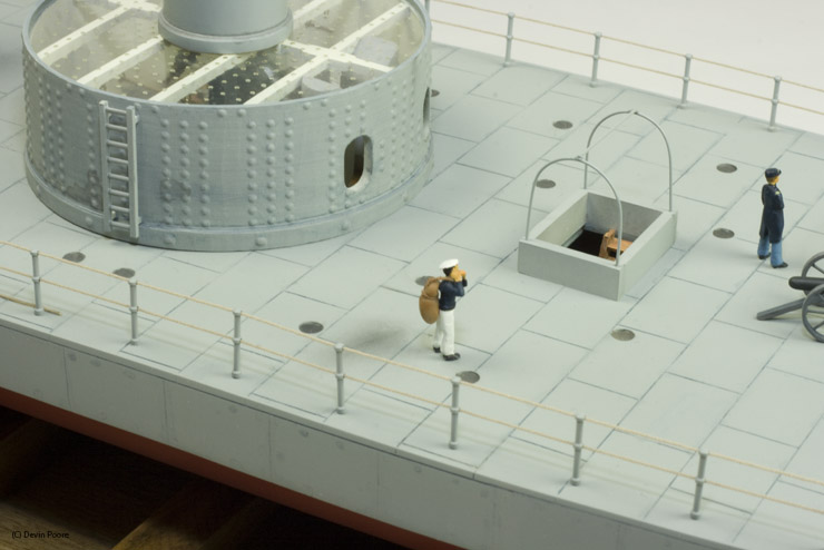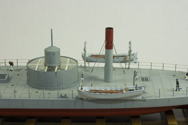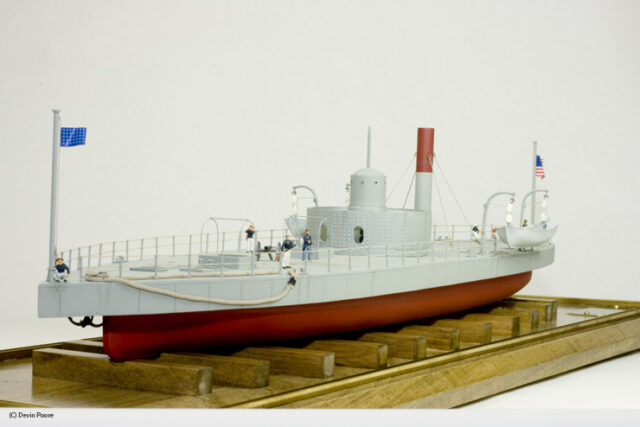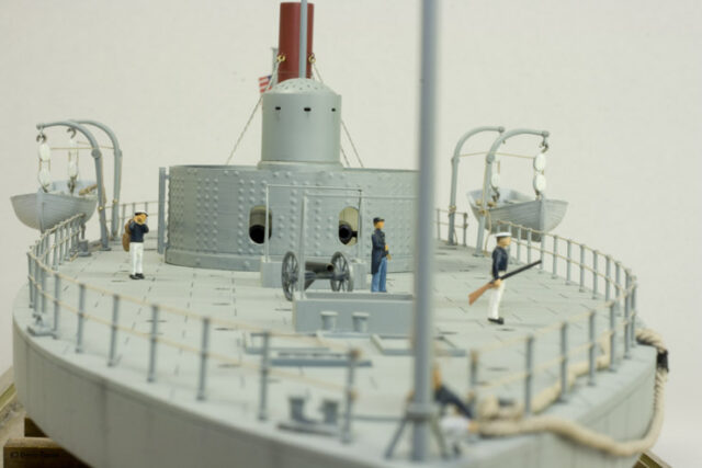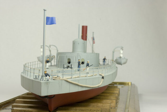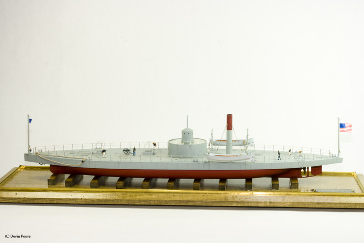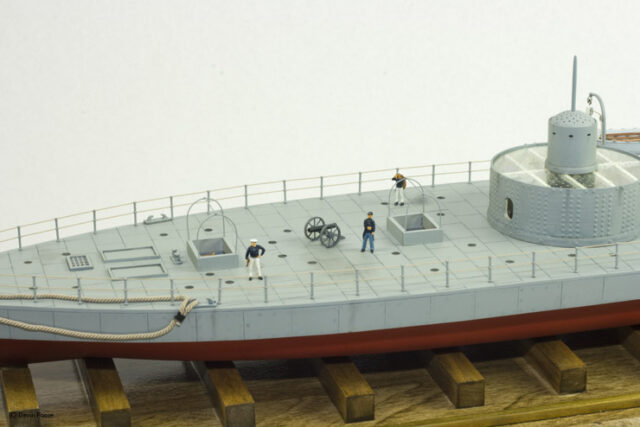 This is the (now defunct) Old Steam Navy 1/96th scale kit, resin, 26″ overall length. I did a lot of additional work to the basic kit to arrive at the finished model. This includes scribing the deck and hull armor and rivets, scratch building a ship interior (which is mostly invisible on the finished model) and scratch building a large amount of the turret interior.