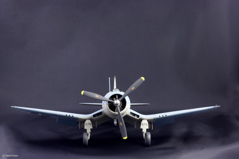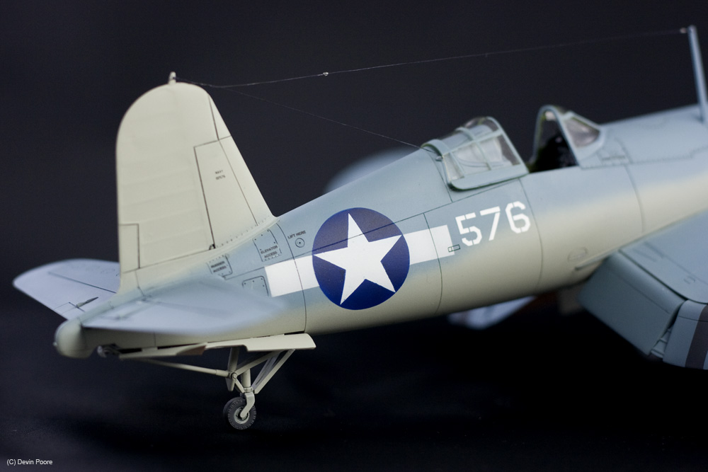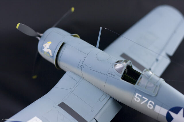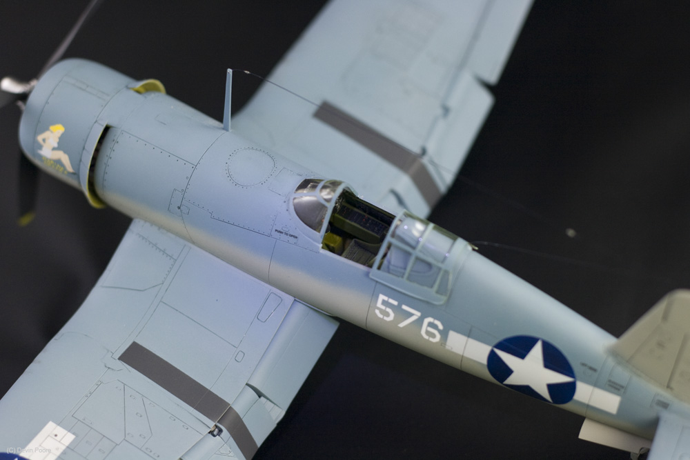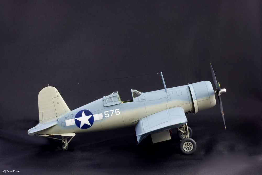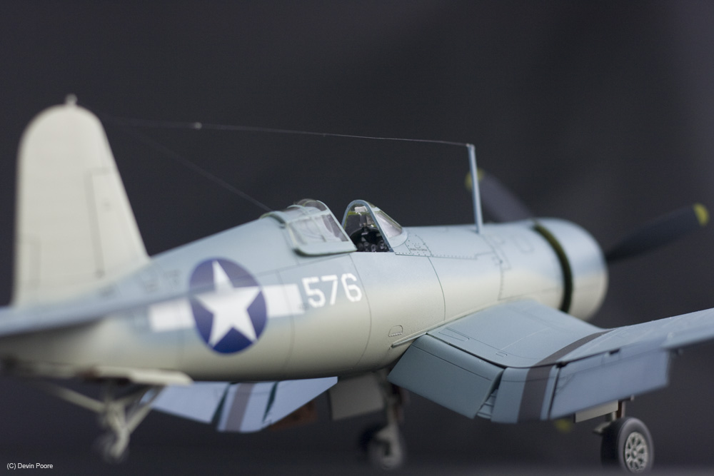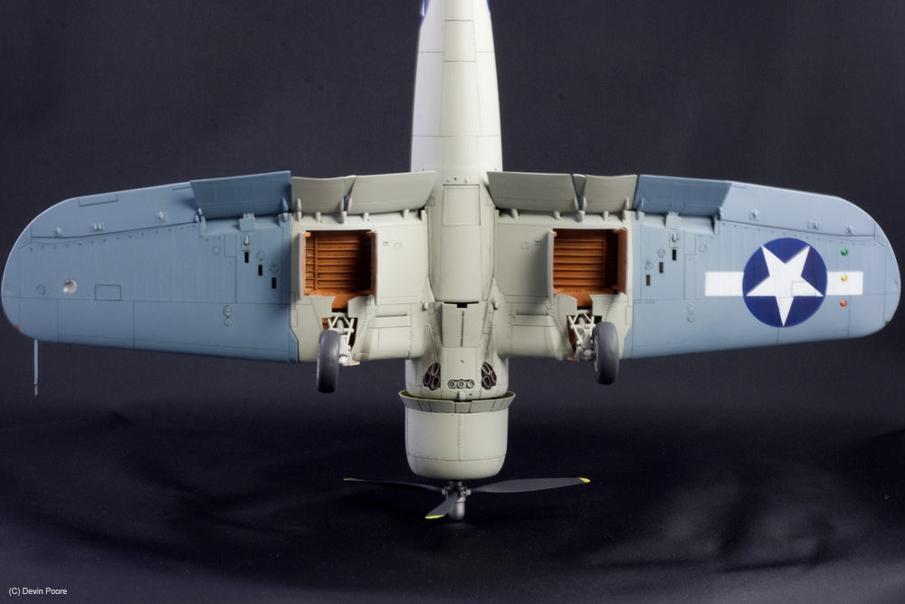 This is the nearly perfect Tamiya 1/48th scale kit of the F4U-1 Birdcage variant. Assembly was a piece of cake, and below the photo gallery I have links for my blog posts that show the build progress. I had very few problems with the model, and the ones that I did have were completely self imposed. I bought this model and stuck it on the shelf for over ten years. When I finally pulled it down to start the build, I found that it had an aftermarket resin engine and exhausts as well, so I used them. They are nice improvements, but there’s nothing really wrong with the kit components. The early Corsairs had this funky salmon-colored primer in the wheel wells. I wanted to get as many colors on this thing as possible, so I went with that, used Interior Green in the cockpit, and all other internal areas are Yellow Zinc Chromate. Vallejo acrylics were used throughout for detail painting, such as instruments, placards, knobs and switches; and their excellent German Gray was used for all instances of black. Pure black in this scale makes things look too toy-like, so I always use really dark gray.