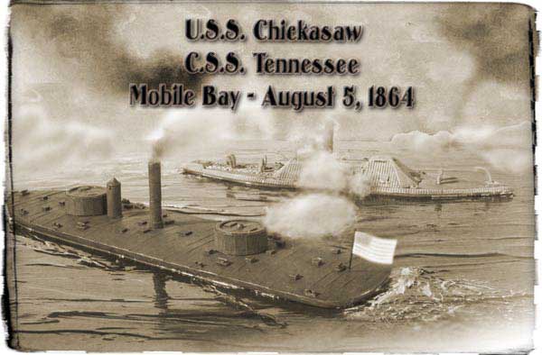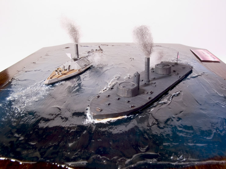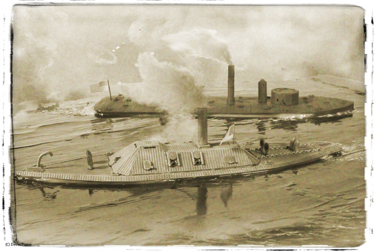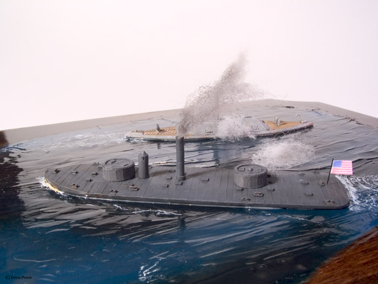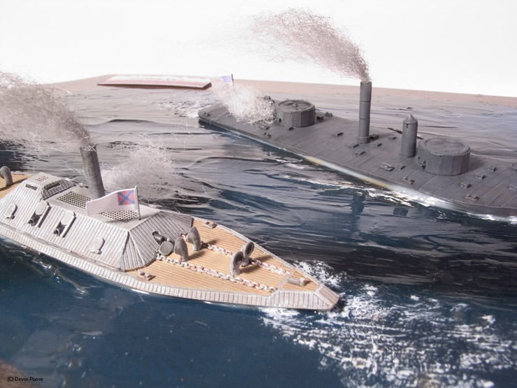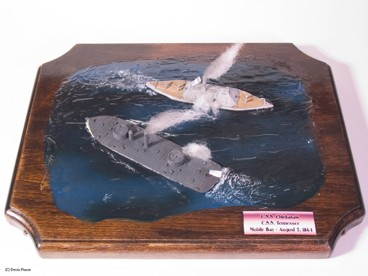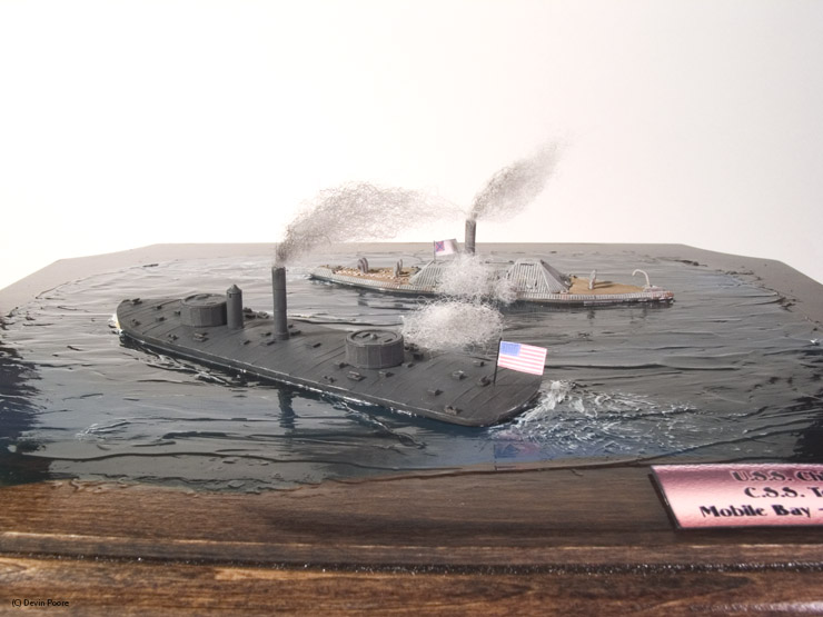 Thoroughbred Miniatures makes many 1/600th scale kits of Civil War ironclads, cast in white metal. U.S.S. Chickasaw and C.S.S. Tennessee by Thoroughbred, were used in this diorama. Both models are just under five-inches in length. As I’ve said before, the Thoroughbred kits are fantastic. The only modifications I made were to drill out the gun barrels on both ships, and to make smaller flags.