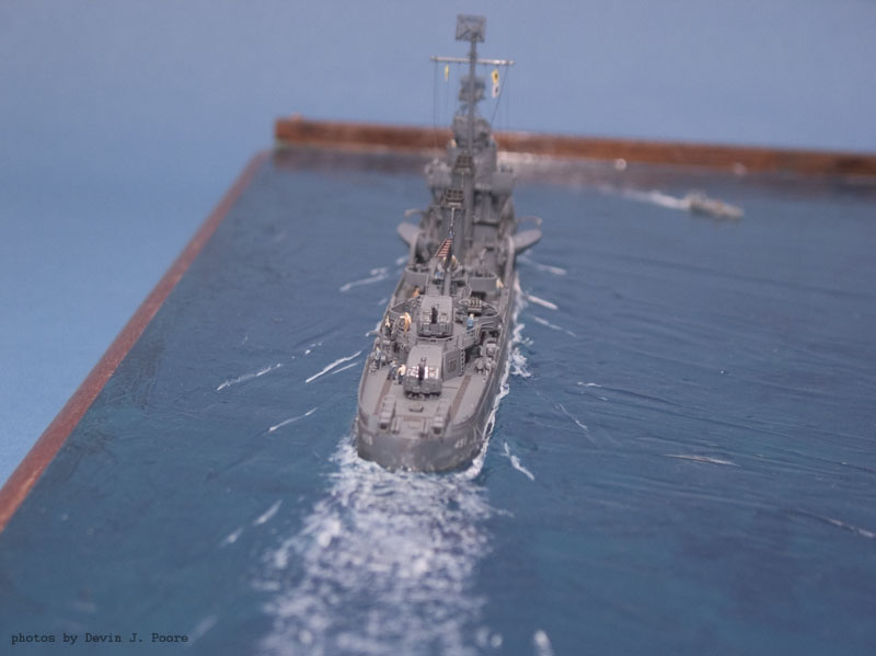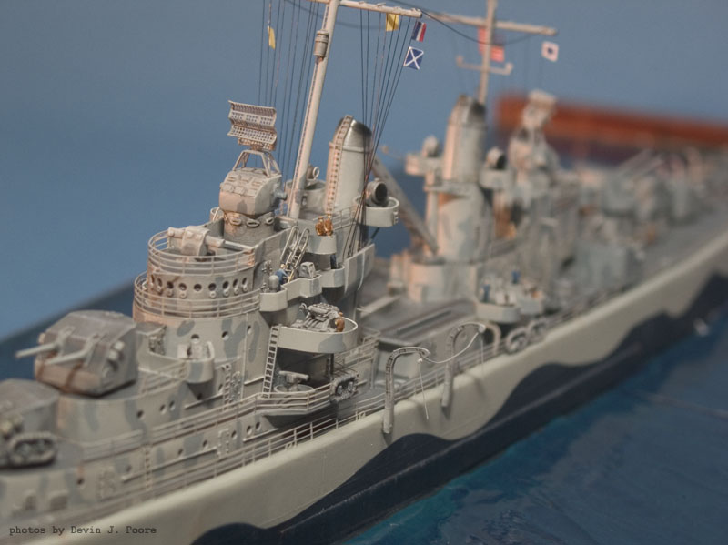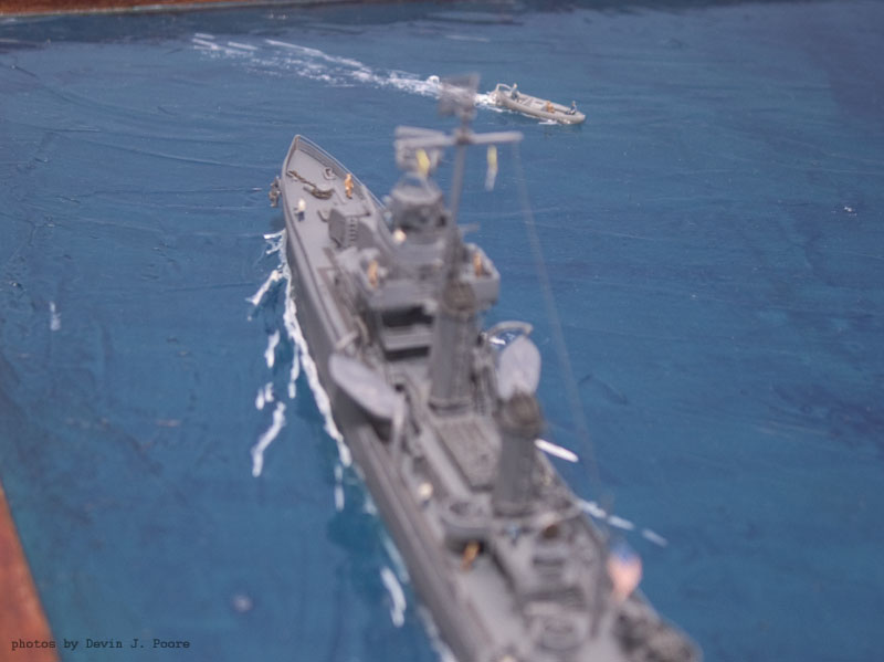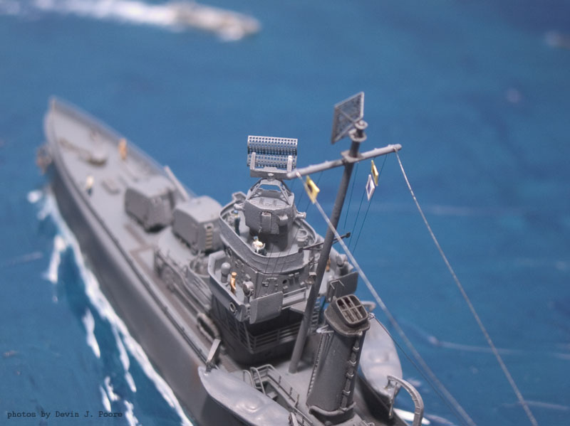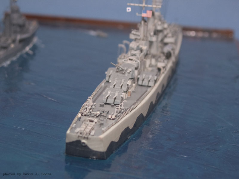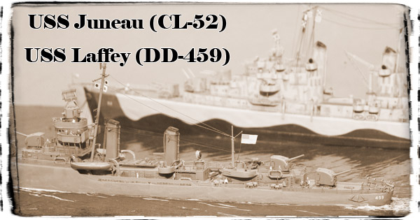 The cruiser is the Yankee Model Works kit of the USS Juneau. I built it almost out-of-the-box. The destroyer is the USS Laffey; it is kit-bashed from a Yankee Model Works USS Farenholt and USS Aaron Ward kit.