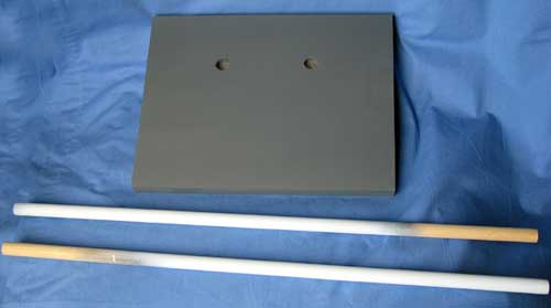 Here are the three components of the base. A 1/2 inch wooden dowel cut to two equal lengths, primed and sanded, and then painted white to blend with the ‘smoke’. The board is simple maple, with two 1/2″ holes drilled to accept the dowels. It was also primed and sanded to hide the wood grain. Basically, the dowels get glued into the base, and then they slide up into the hollowed out thruster cones of the SRB’s. Simple enough.