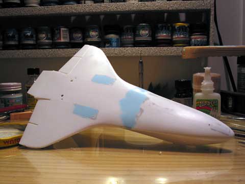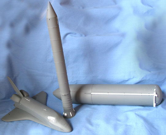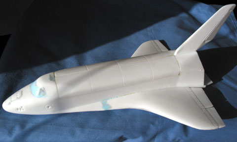 Major components after several weeks of filling and sanding. At this stage the boosters have already been spray-primed once, and further sanded to fix discrepancies found. The orbiter is ready for it’s first overall coat of primer. You might notice that the areas that should be clear windows are shades of blue putty and gray primer. The fit of the kit’s windows was so bad that I could not salvage them. I’ll be using kit decals to replicate them instead.