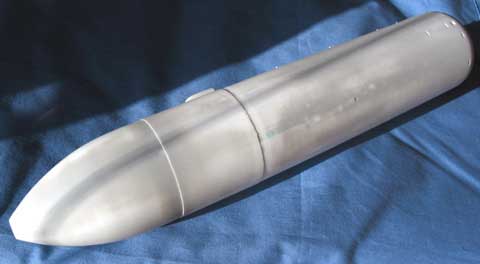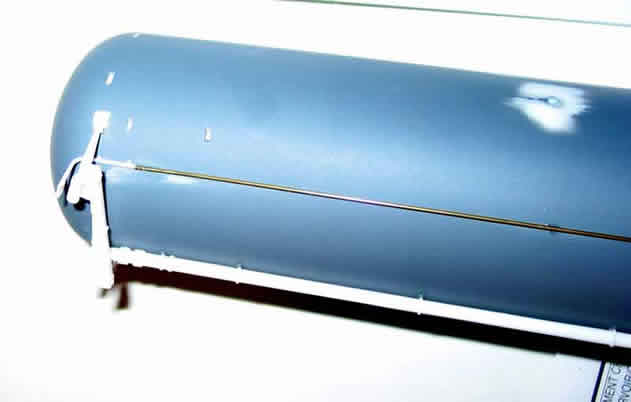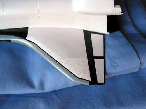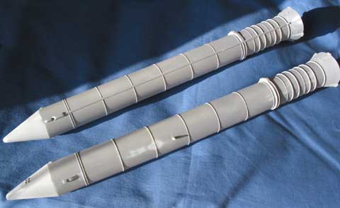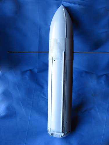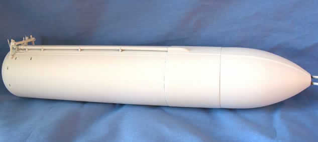 First photo above shows the completed external tank with a big honkin’ brass rod run through it. This rod is cut to size and used as the mounting point for the top of the SRB’s (solid rocket boosters). The entire shuttle stack when complete will be supported by this joint between these three items, so I want it sturdy and well reinforced; the scale -yet small – booster attachment supplied in the kit would not support all of this weight the way I’m mounting it. The second photo is after the brass rod is cut to size and the SRB’s are attached.