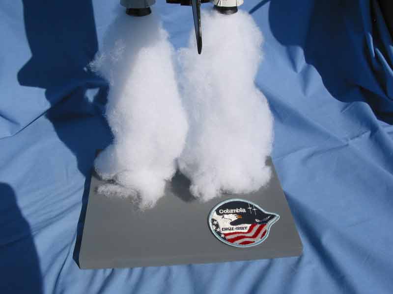 The smoke for the rocket boosters is created with polyester aquarium floss; it’s the same stuff used to stuff pillows. I just tied it off inside of the nozzles, and then stretched and pulled it downward until I liked the result. The patch is a replica of the mission patch from STS-2.