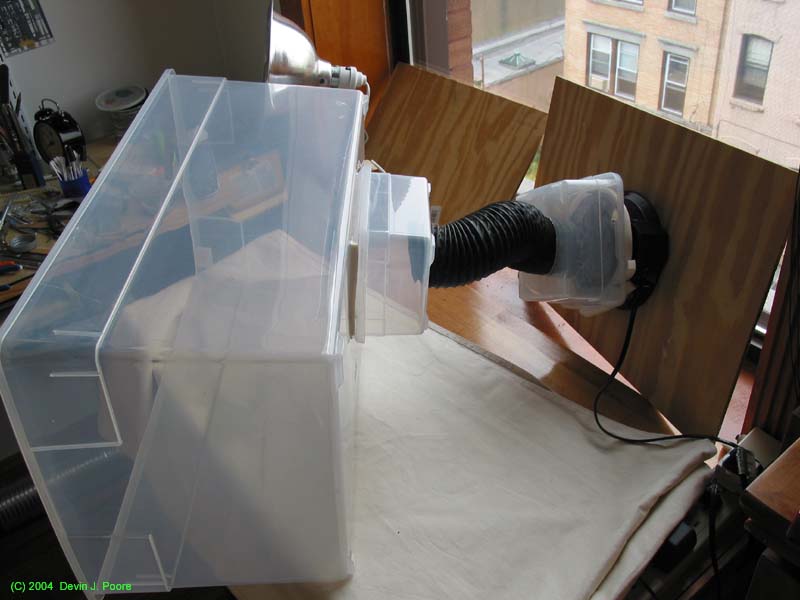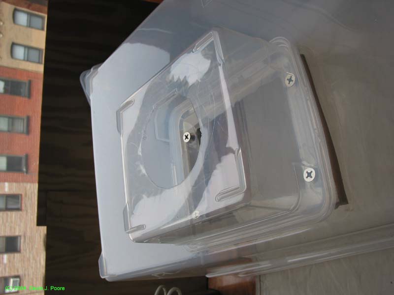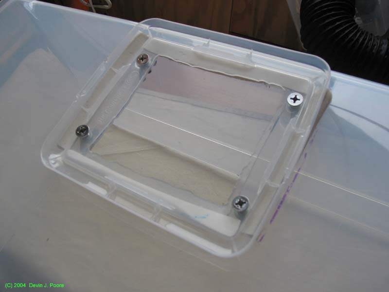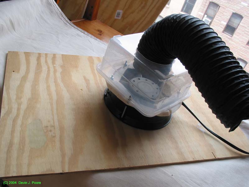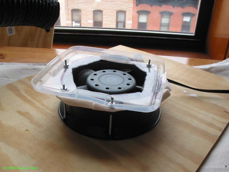 The plywood sits in the window, lower the pane upon it to hold it in place. The fan bolts directly to the plywood, and I just drilled holes into the lid for the second small container lid and attached it to the same bolts. Window weather seal was added as in the booth assembly, and hole cut in the lid with the Dremel tool.