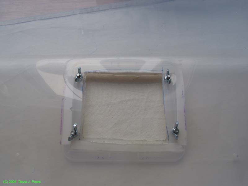 Here we see the back of the large container, with the lid of one of the smaller containers attached. I stuck some window weather stripping between the two pieces, and then bolted them together with bolts and wing nuts to attach them. I used the bolts as double sided tape or adhesive backed Velcro was not sticking very well, and I wanted these components removable for storage. The cutouts in the lid and larger container were made with a Roto-Zip spiral saw bit that I chucked into my Dremel tool. Worked perfectly.