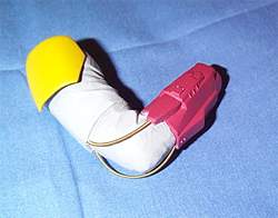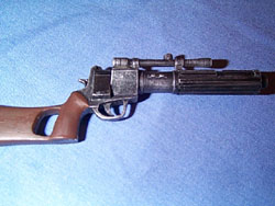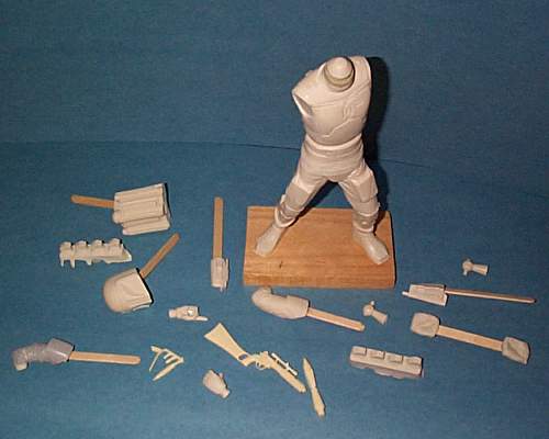 Kit parts. The bulk of them are vinyl, an odd substance to work with. Items such as the blaster, rocket, and a few other detail parts are cast resin. The Popsicle sticks are for manipulating the parts while I’m airbrushing them. I plan on painting most of the parts before assembly on this kit, as the kit is posed with both hands holding his rifle. It would be a bit tricky, for me at least, getting all the parts of both arms to come together at the correct spot if they’re assembled first. (And, yes, I know I need better lighting for taking photos. I’m a workin’ on it).