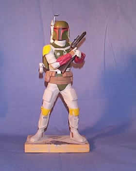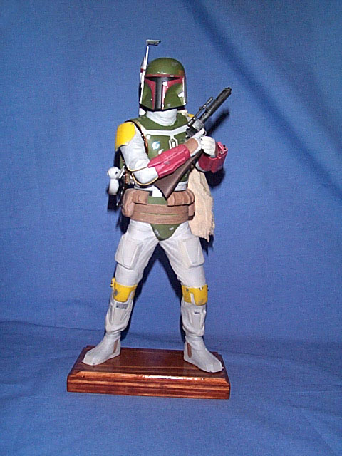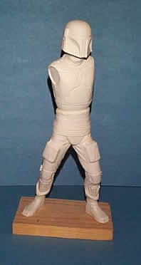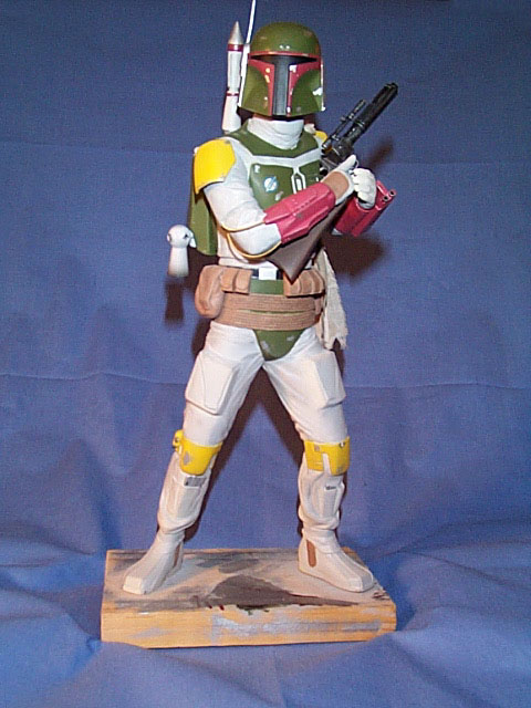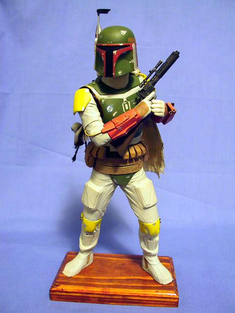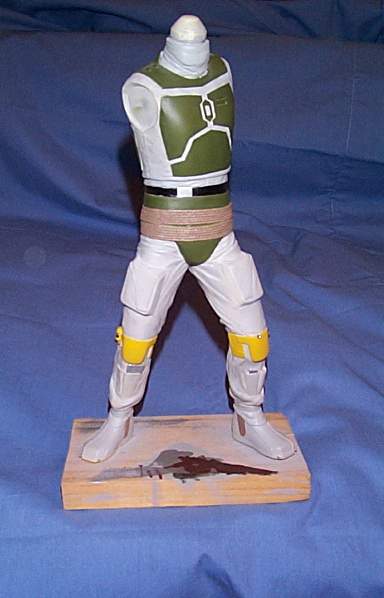 Main torso assembled with head attached. The Boba de Milo? Boots glued to legs, legs to torso. I placed bolts in the bottom of the feet, to secure it to the temporary wood base (and the eventual final base). The whole assembly was then filled with plaster to give it some weight and prevent the sagging vinyl kits are known to go through. I thought he looked quite turtle-like with the neck being as short as it was, so I added about 1/4″ to it before attaching the head. On the right side of the torso I also removed the molded in Wookie scalps, which will later be replaced with braided theatrical hair.