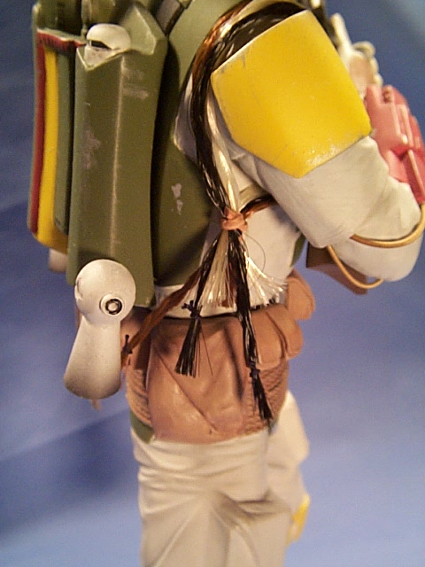 The rest of the process involved final detail painting, adding extra bits such as the hoses into his gauntlets fashioned with guitar string, and the Wookie scalps made from braided theatrical hair and beads. The kit’s vinyl cape was replaced with flour sack cloth, stained tan, then soaked in a white glue and water solution so that it draped naturally over the model.