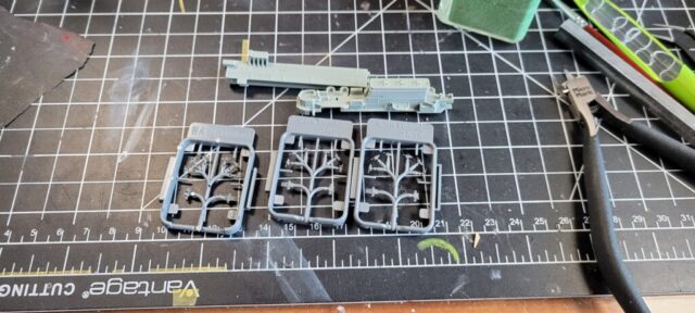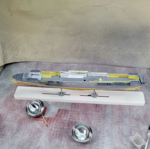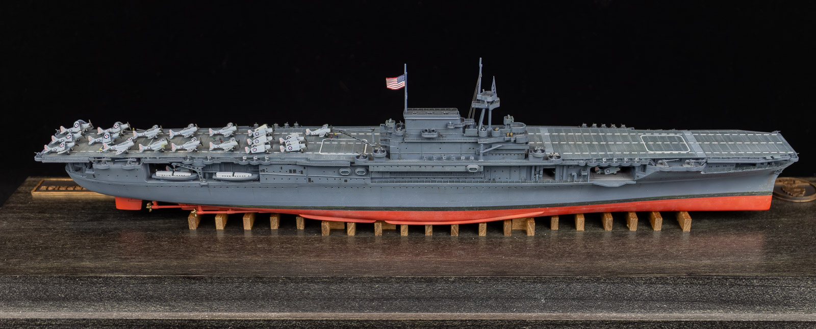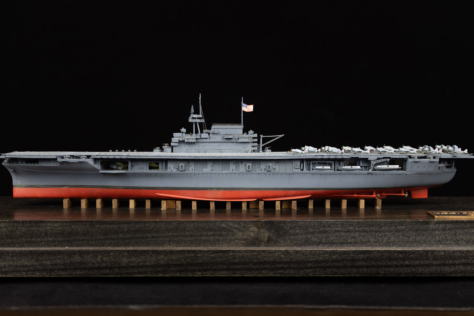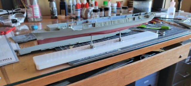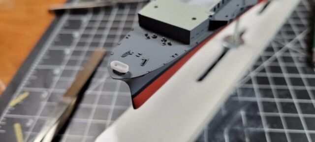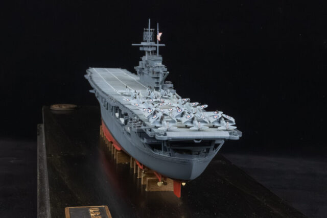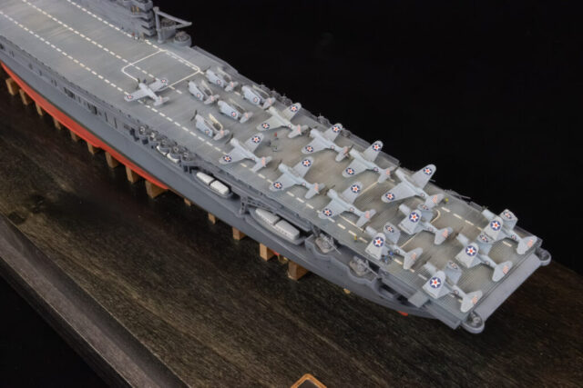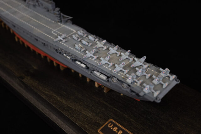 Construction was simple and straight-forward. I opened up the hangar deck roller doors so the interior can be seen. There’s little to no detail in there, though, so I filled a lot of injector pin marks, then added interior detail with photo-etched doors, ladders, and hose reels. The main structures under the island where the stacks trunk into the funnels was completely missing, so I drew those in CAD and 3D printed them. The only real issue with the hangar deck is the forward elevator well. That entire area is mostly solid in the model, for what reason I can’t imagine. I put a plane in the area to camouflage it a bit. If I were to build this kit again, I’d simply leave those forward hangar roller doors closed. To show off the detail I put minimal LED lighting in the hangar deck, something simple that runs off of a single watch battery, activated by a brass switch I made from brass rod and a small electric switch, mounted in the wood base.