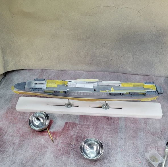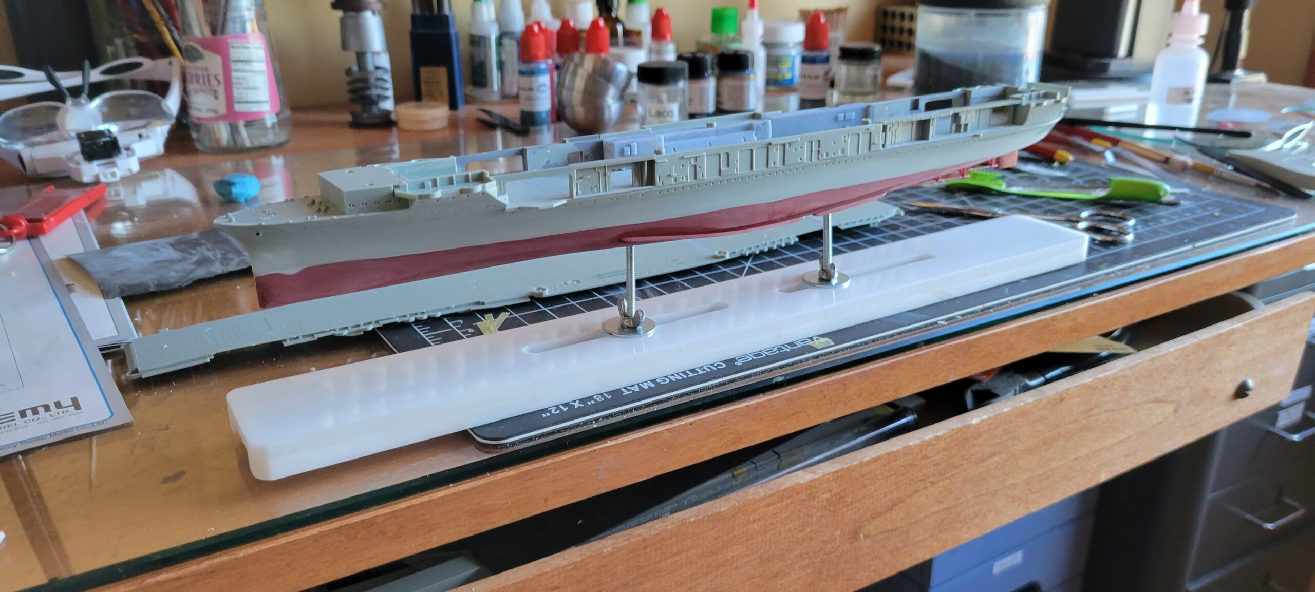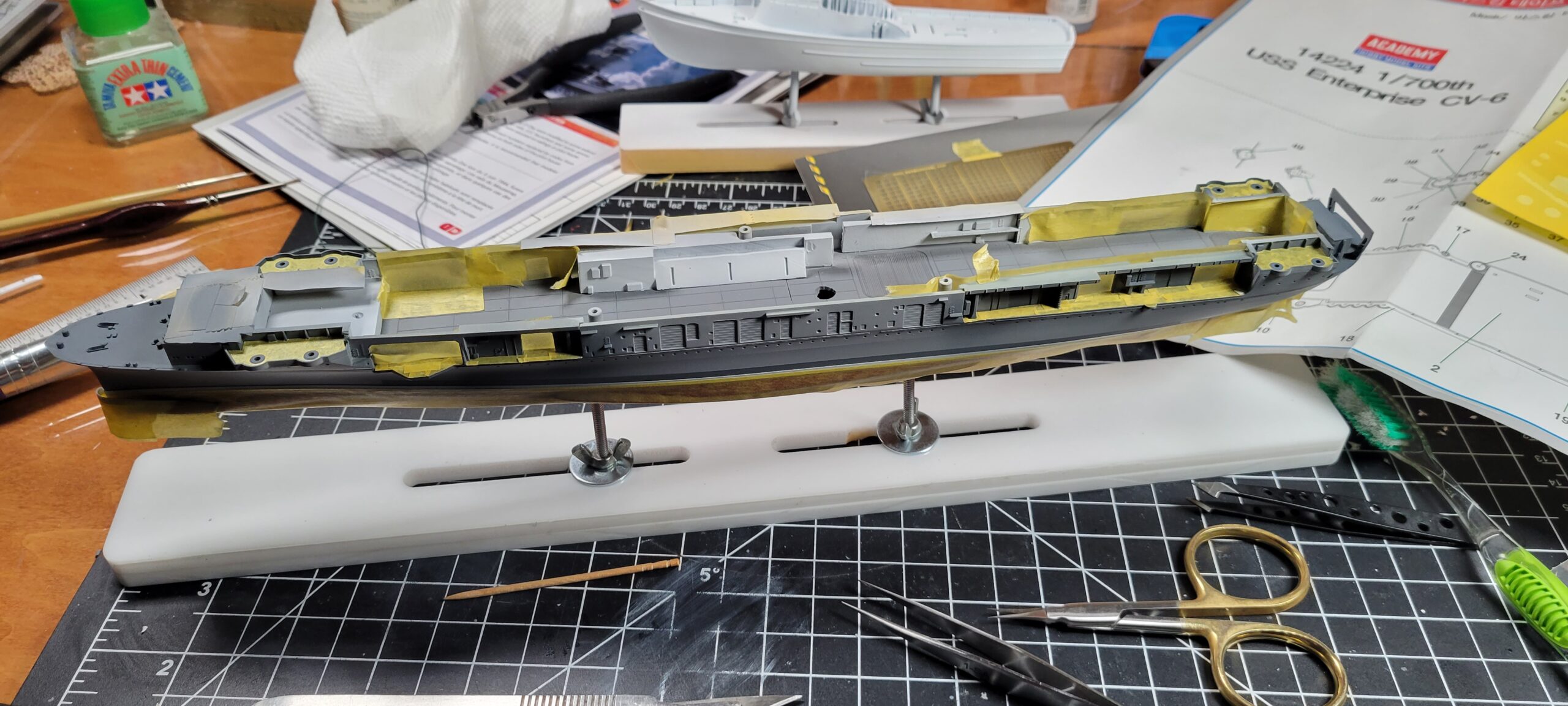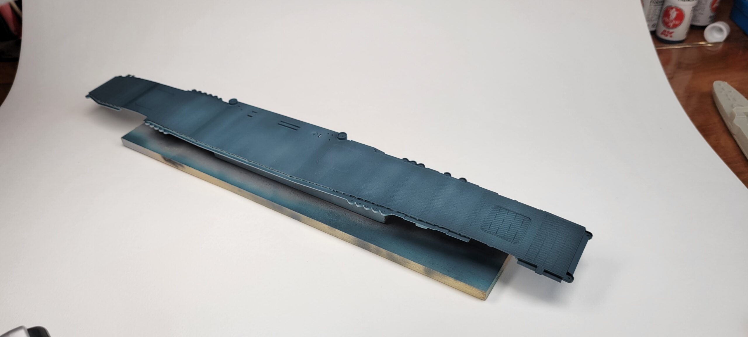 Flight Deck – AK 3rd Gen, 2 parts 11190 Dark Sea Blue 1 part 11173 Ocean Blue. That was too green, so overshot it with 2 parts Dark Sea Blue to 1 part Dark Blue Gray. Much better. Could still be less blue. THEN, I went over that with Tamiya Buff, mostly covered, then covered that mostly with Model Master Acrylic 250N.