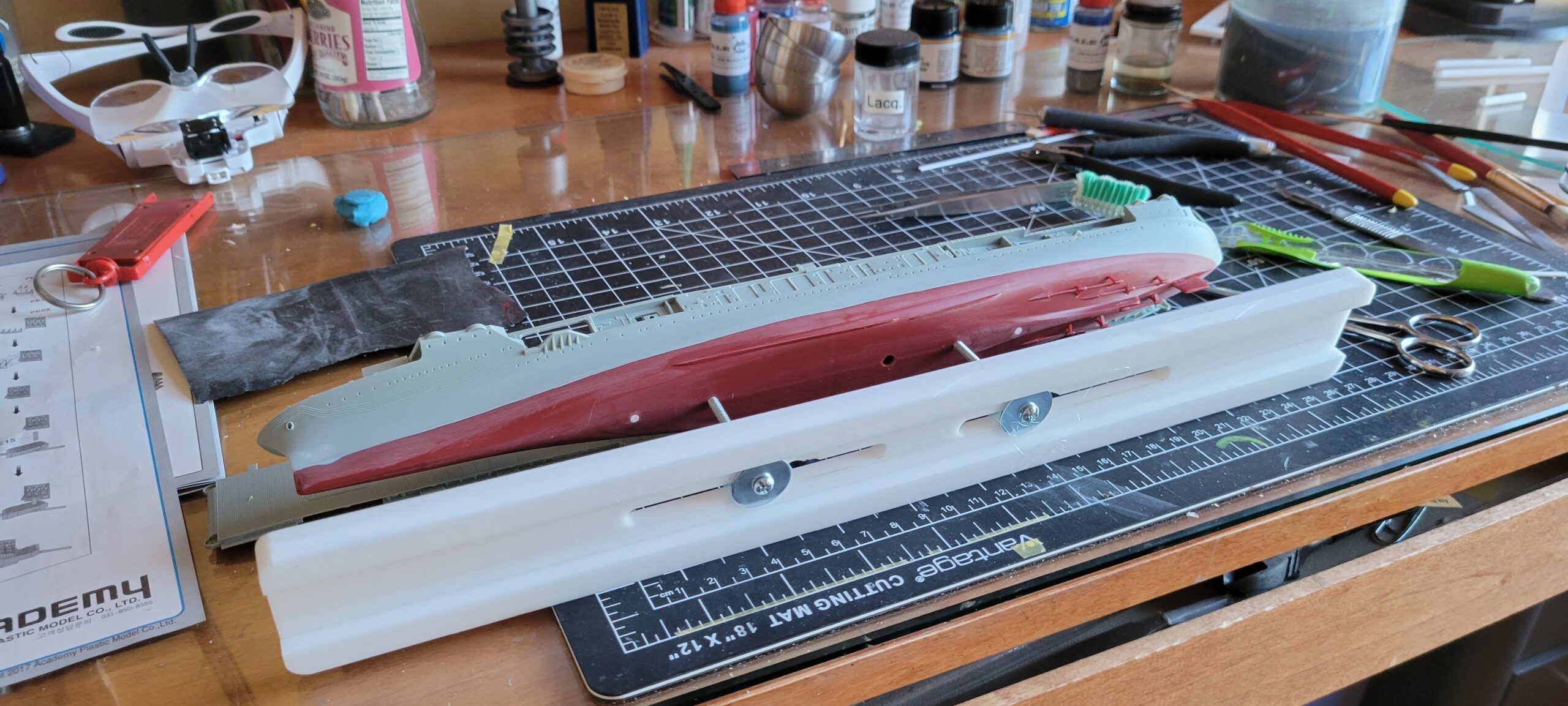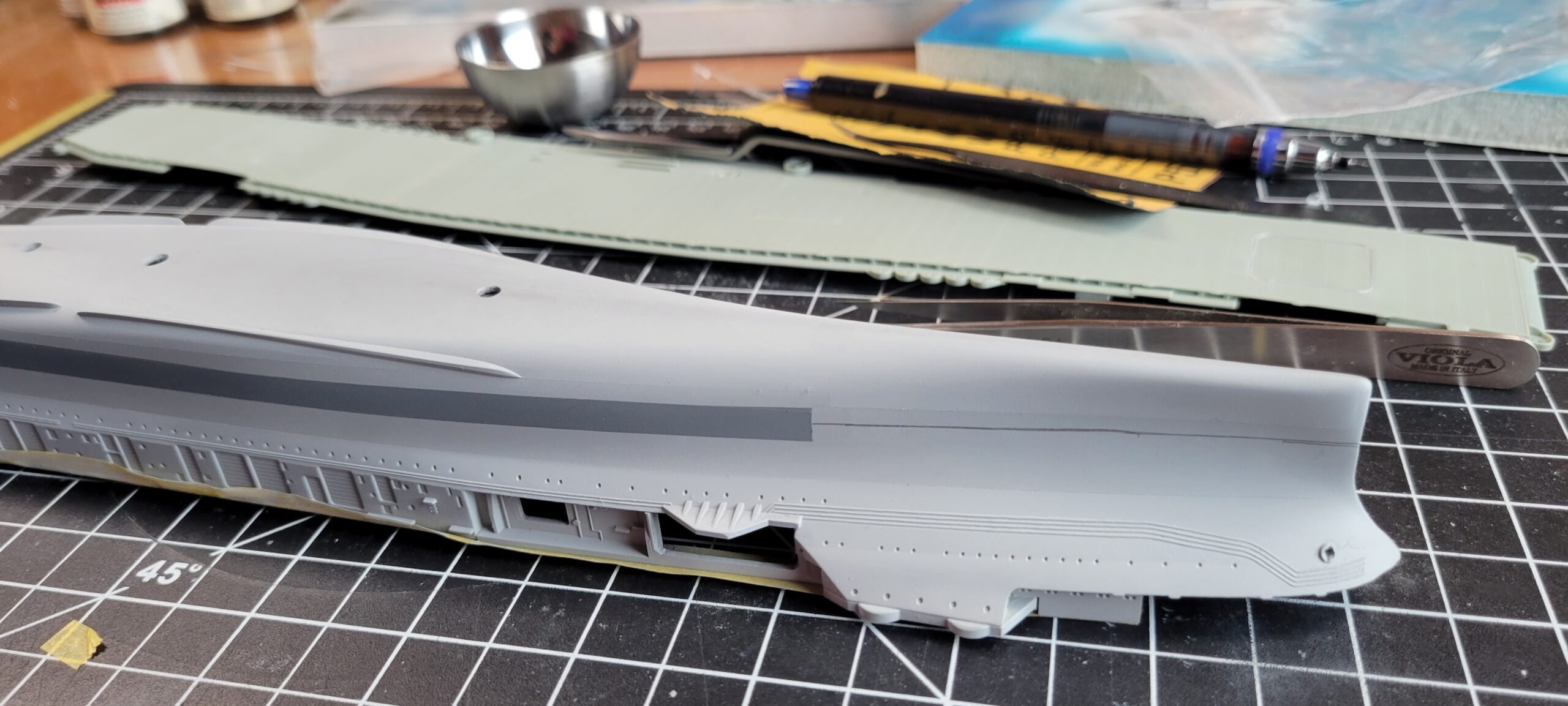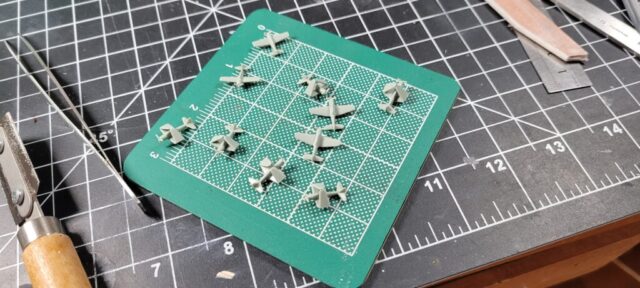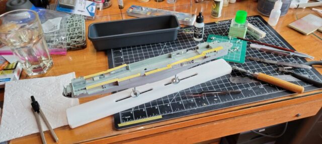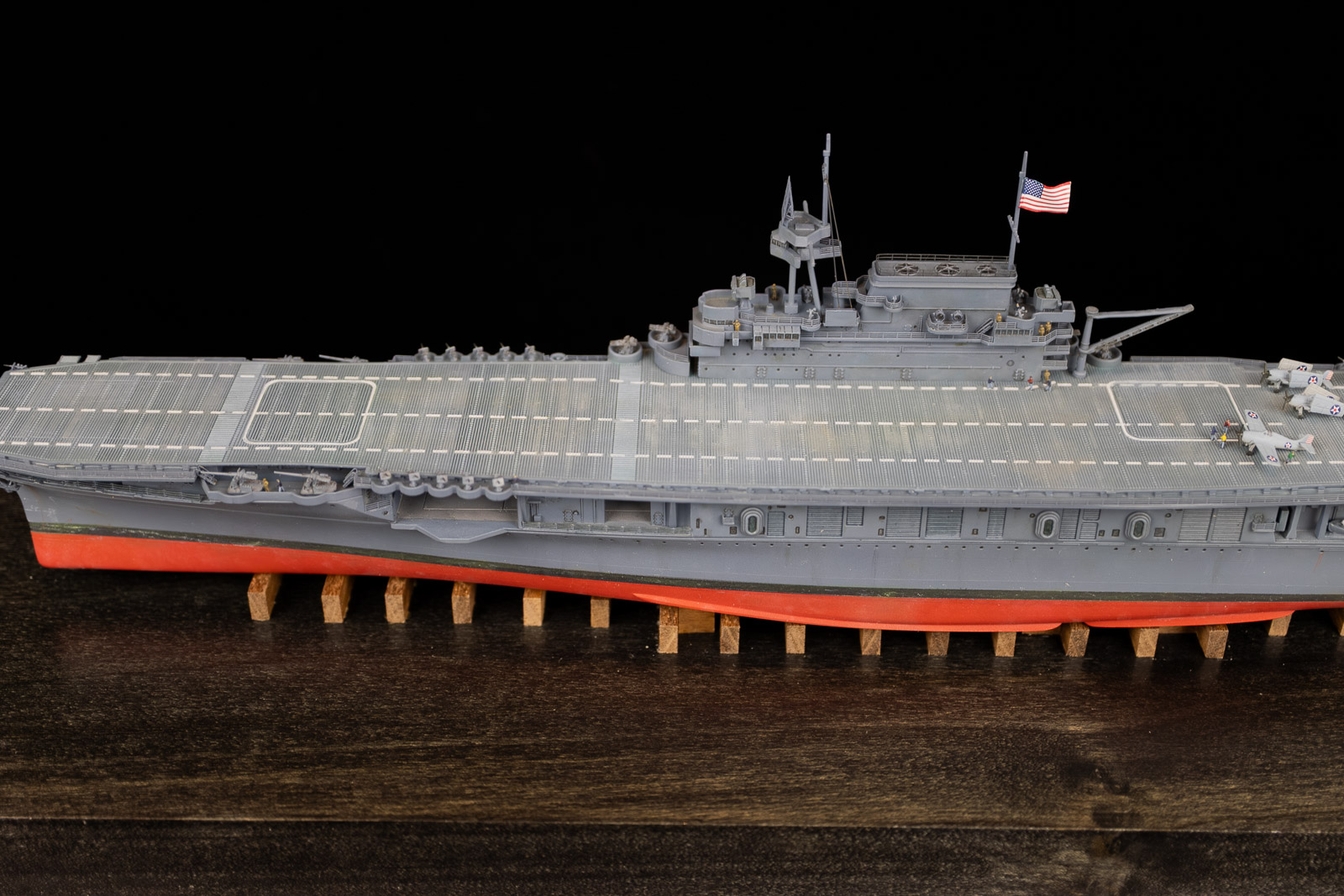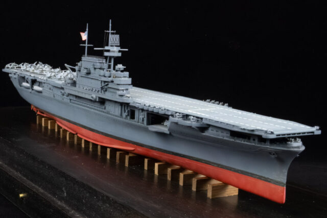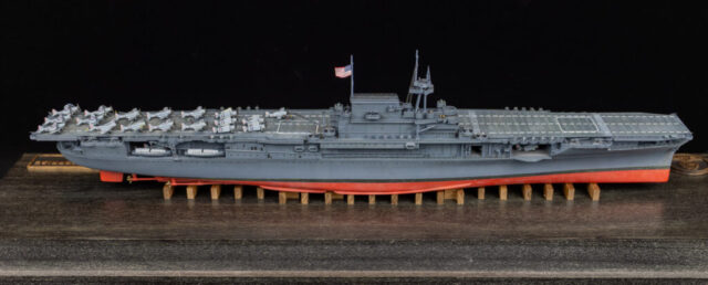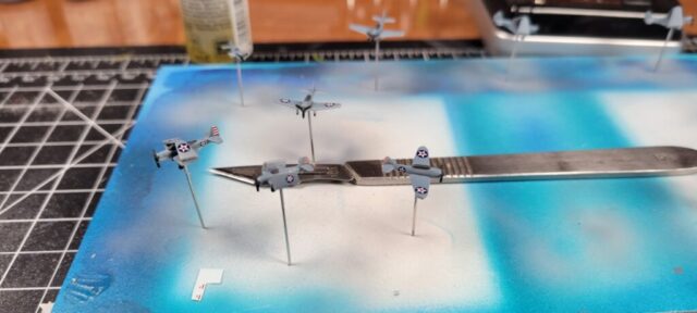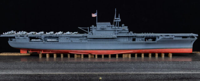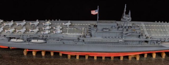 For paint I used my dwindling supply of Testors’ Model Master Acryl paints, 5N Sea Blue for the hull, and early war gray for the aircraft. They’re still my favorite paints: easy to spray and brush paint, colors maybe not exactly 100 percent accurate to S&S paint chips, but close enough and they have the look that feels right to me for a weathered warship and aircraft.