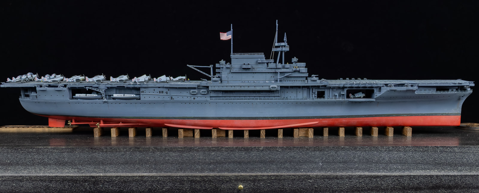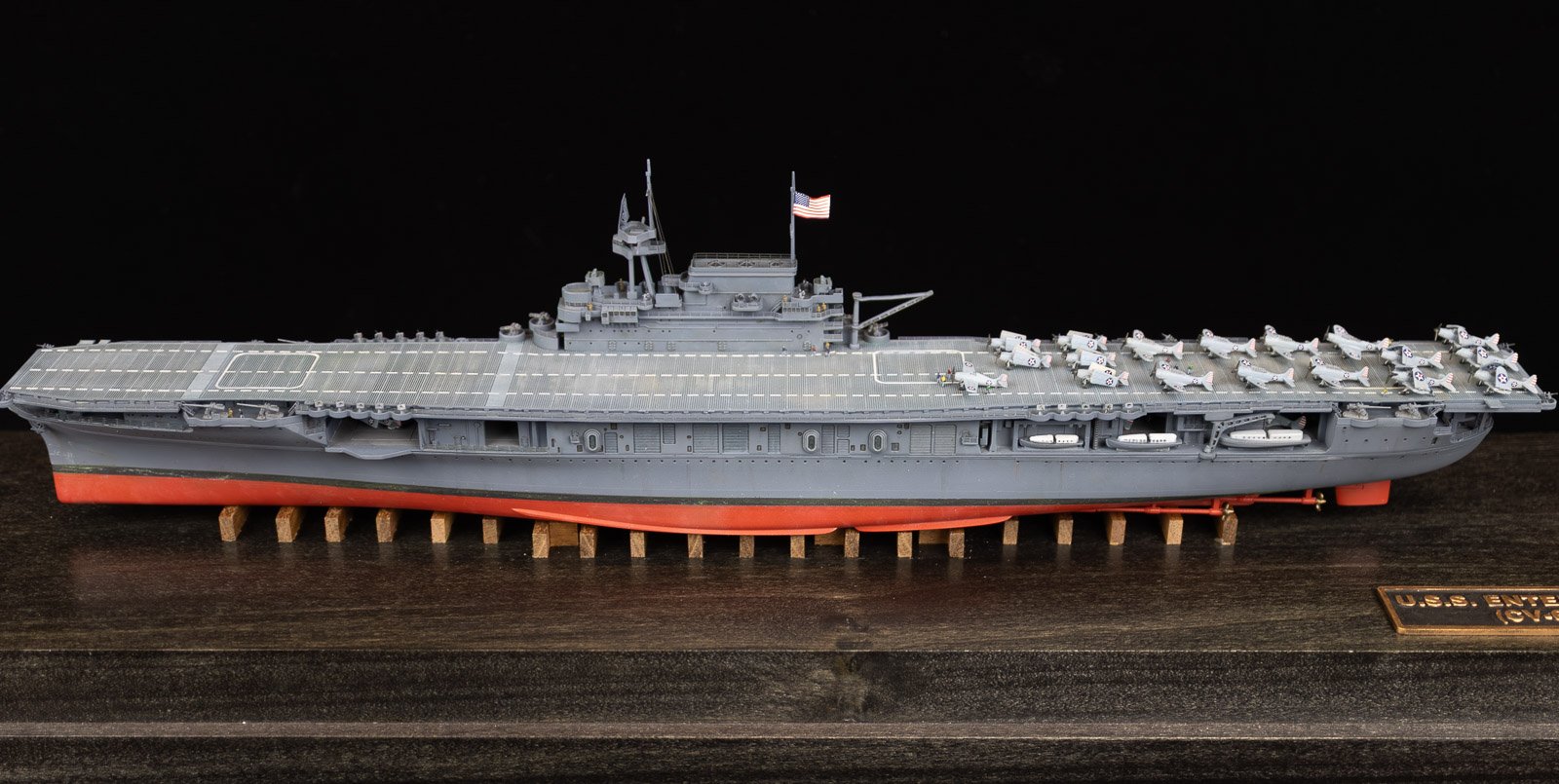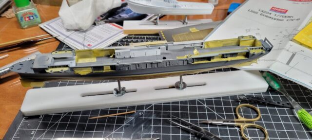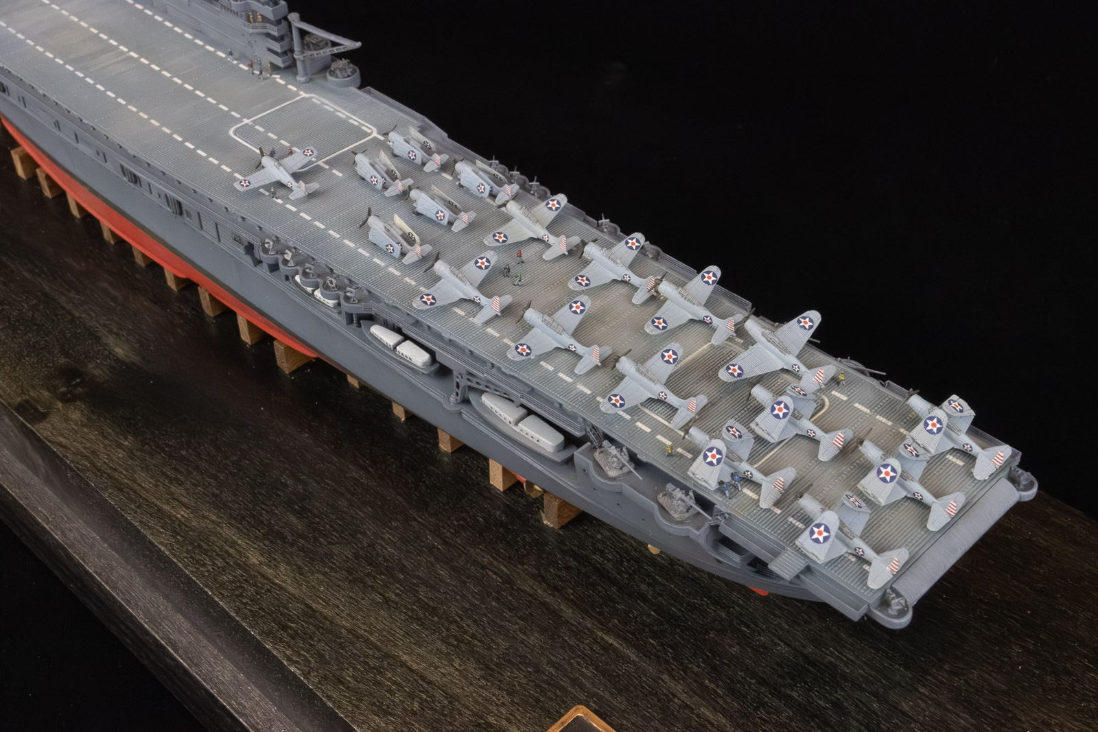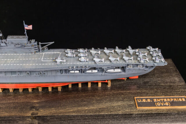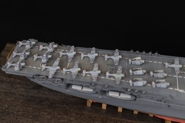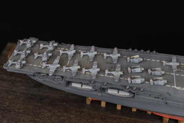 Noticed issues: Along with the weird issue with the forward hangar deck mentioned previously, the only other major problems were the overly simplified aircraft — which look fine filling up the tight hangar deck — and the AA weapons. I’m not sure if the gallery decks are too shallow, or the aftermarket weapons are too big, but they stand way too proud of the flight deck. It’s likely a combination of both. Also, for Enterprise’s fit at Midway, the kit’s stated time-frame, there are slight errors in AA locations around the flight deck, as well as discrepancies in the searchlight locations on the stack. I’m sure there are other issues with boats, liferafts, etc., but I didn’t really care.