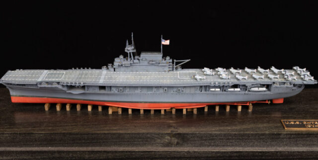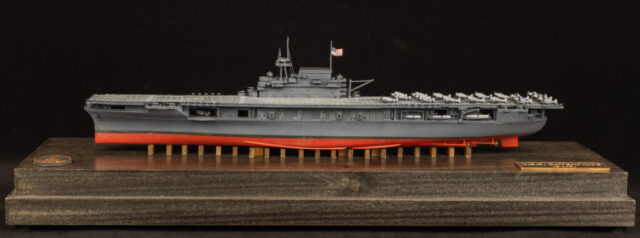 There’s been so much written about USS Enterprise (CV-6), that I’m not going to get into her entire history here. Suffice to say that she’s one of the most famous ships of WWII, and in U.S. Navy history. One of the three Yorktown class carriers, she’s the only one of the three to survive the war (Yorktown lost at Midway, Hornet lost at Santa Cruz). Enterprise participated in nearly every major naval engagement of WWII in the Pacific, only missing Coral Sea. There was talk of preserving her as a museum ship in New York City after the war, but political intrigue inserted itself, and museum ships were a new concept at the time. As a result, she was scrapped in 1956. Her sternplate with the name Enterprise survives, and is slated to be part of the U.S. Navy museum when it opens in Washington D.C. Portholes and other structural components from CV-6 were used in the nuclear carrier U.S.S. Enterprise (CVN-65), and have been taken from that ship as she is scrapped, to be integrated in the new U.S.S. Enterprise (CVN-80).