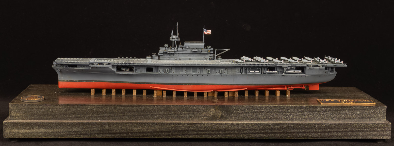 Final steps for the project were the base, cut from poplar and washed/stained black, keel blocks cut from… some sort of wood that I’ve forgotten. I drew and printed the nameplate and ship’s crest. An acrylic cover was sourced from Grandpa’s Cabinets, who does outstanding work.