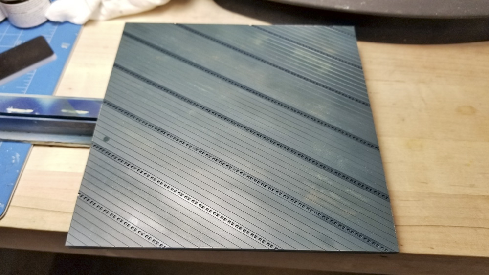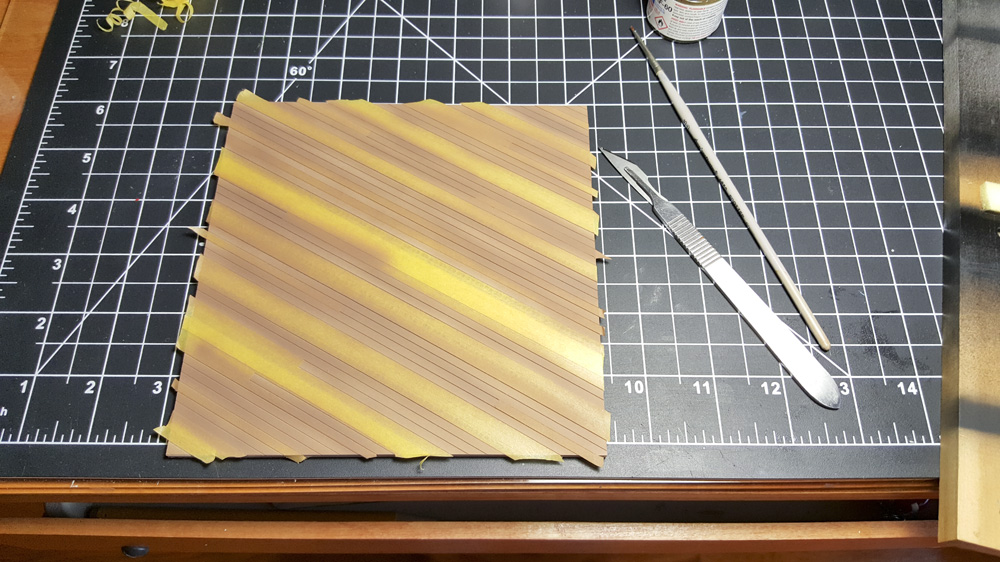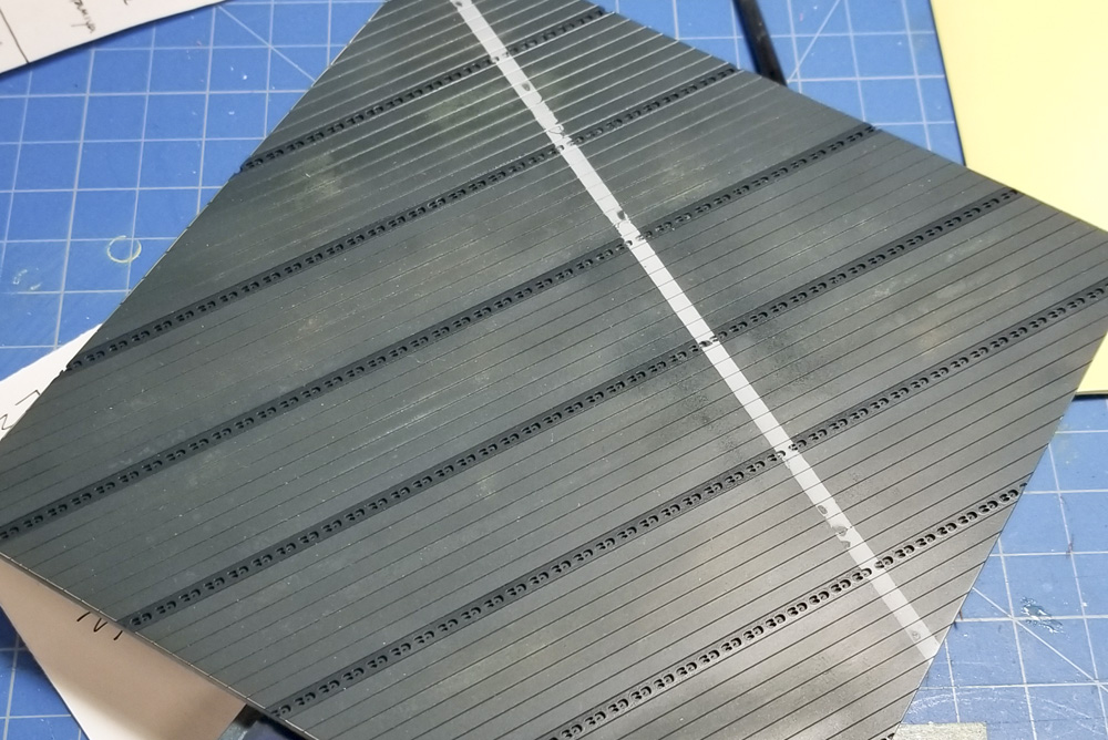 I drew the flight deck base in Rhinocerous, then laser cut it out of acrylic. Yes, the planking scheme is correct for Yorktown. I painted the deck wood, then applied layers of blue over it, scuffing and sanding to get a worn look. The black frame is made from poplar wood I cut on a table saw, with the nameplate being reverse cut on clear acrylic with the laser, to allow painting from behind.