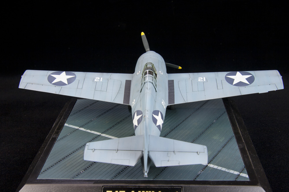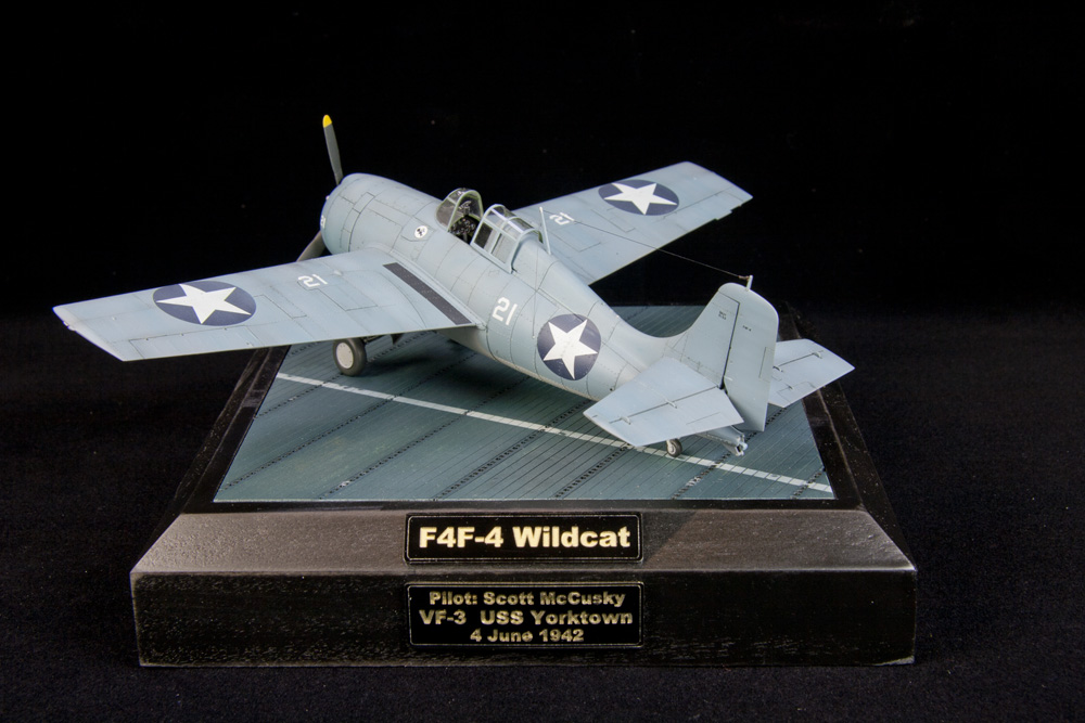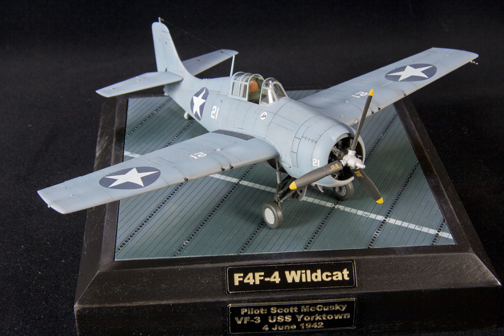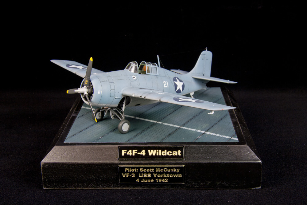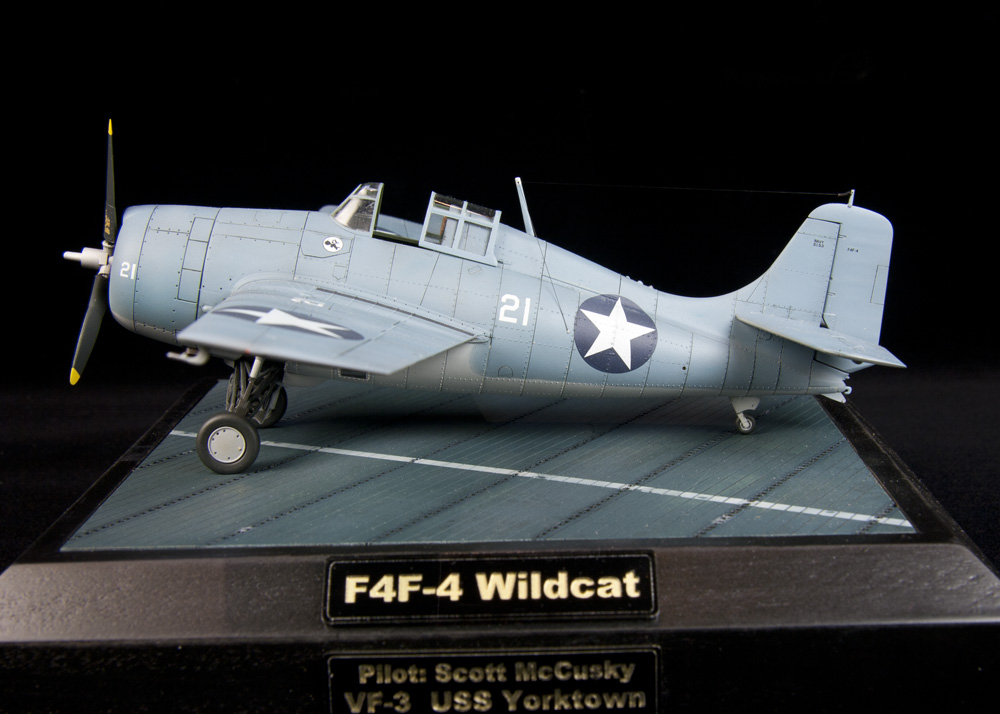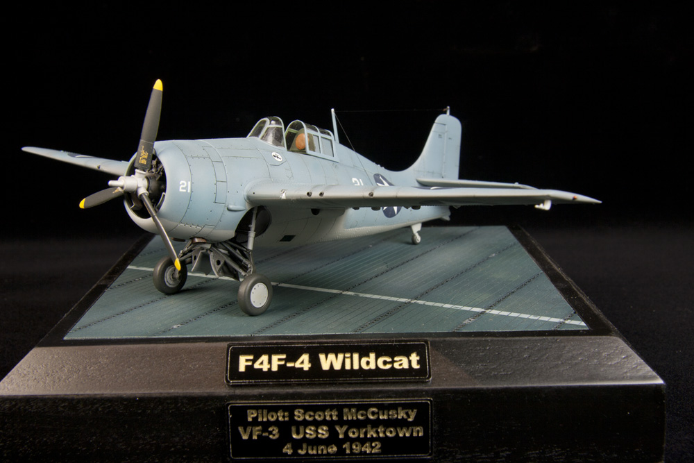 Initially taken into combat by the British in Europe during 1940, the Grumman F4F series of fighters’ main theater of operations during WWII would be in the Pacific. Technically outclassed by the Japanese Zero, the Wildcat was known to be slower but tougher, and when flown by well-trained pilots using proven tactics, it was able to hold its own against the faster and more nimble enemy fighters. This version, the F4F-4, saw improvements over it’s predecessor, the -3: more guns, heavier armor, folding wings, and, later in its career, longer range when fitted with external drop tanks. While the F4F-4 would be replaced in front-line service in the Pacific by the F6F Hellcat and F4U Corsair starting in late 1943, further versions of the Wildcat would continue to serve in modified versions, in foreign service, and on small carriers as amphibious landing support in the Pacific, and hunting submarines in the Atlantic. I built this Wildcat in the markings of Lt. E. Scott McCusky, a pilot aboard U.S.S. Yorktown (CV-5) during her combat career in the Pacific. McCusky flew this particular aircraft, F-21, as part of Yorktown’s CAP on June 4th, during the Battle of Midway. He’s credited with 3 Japanese dive bomber and 2 torpedo plane kills that day.