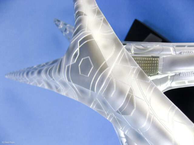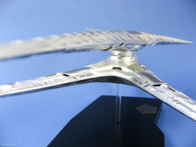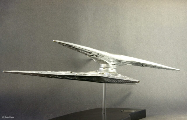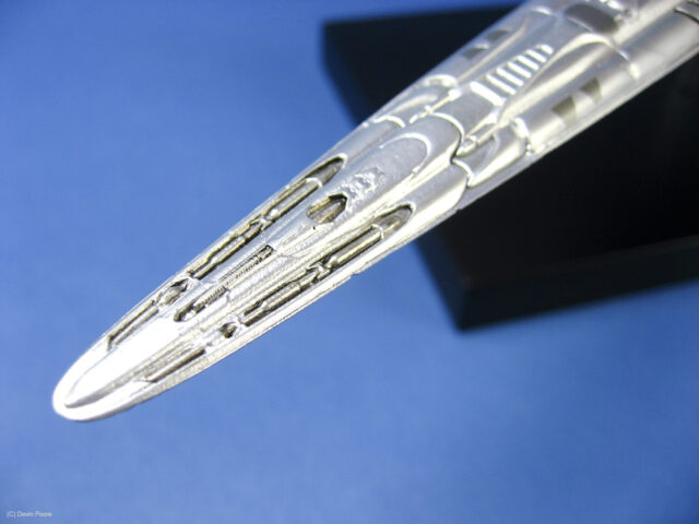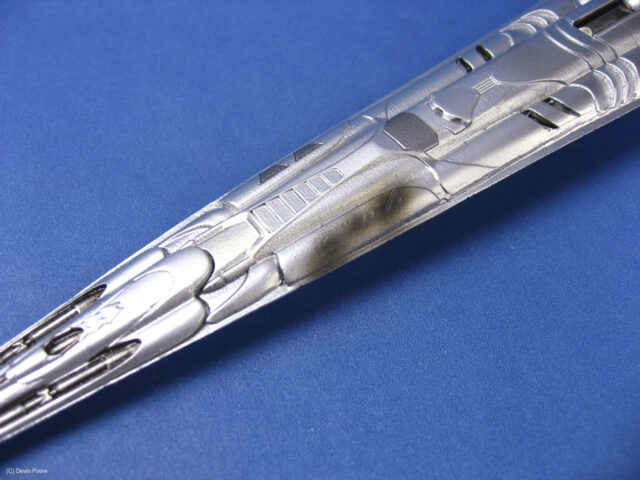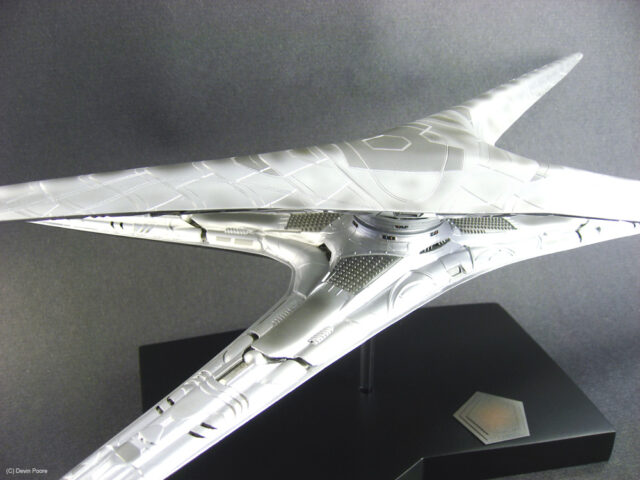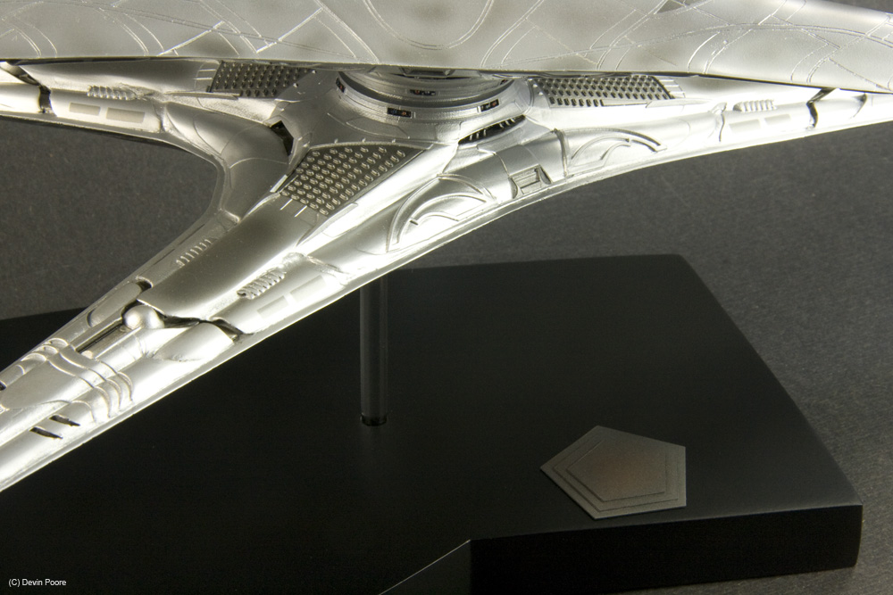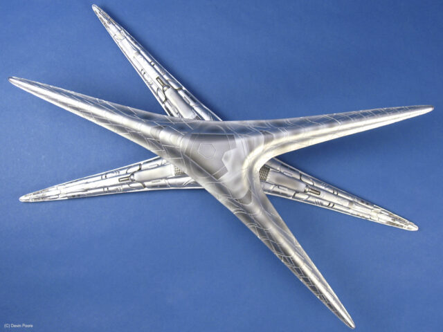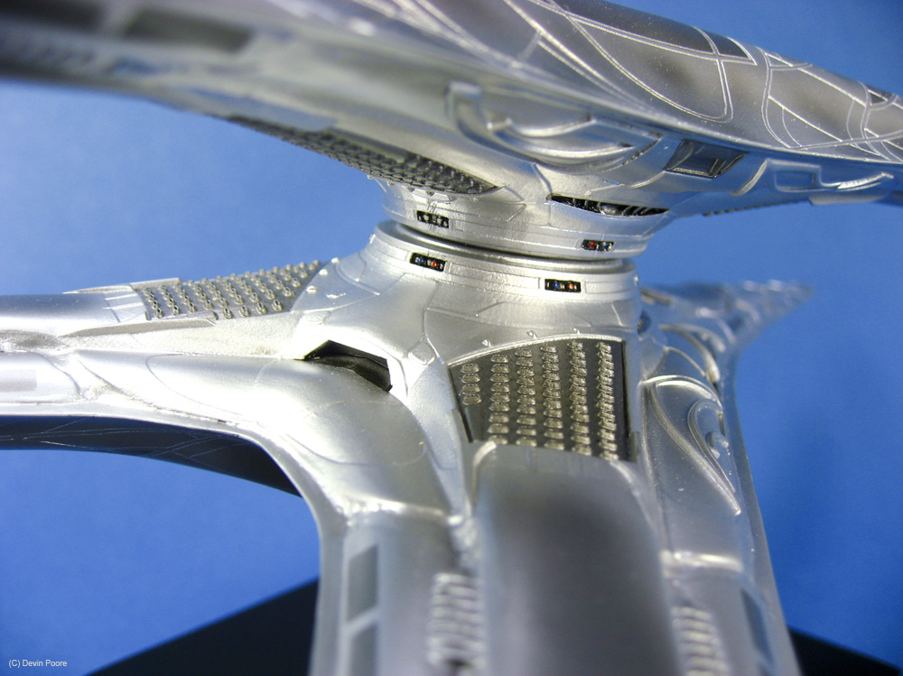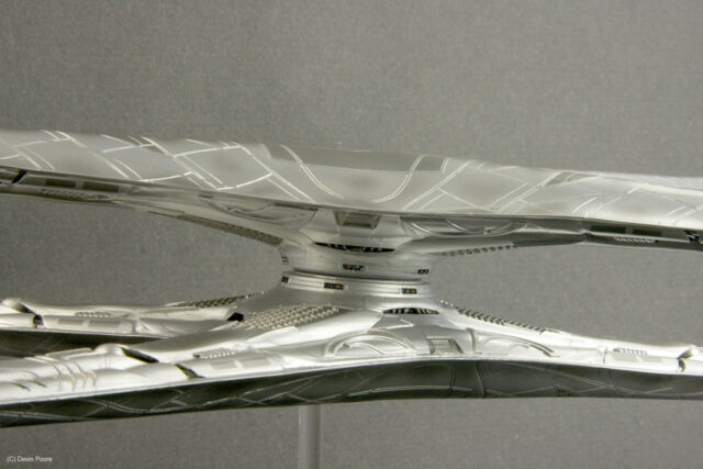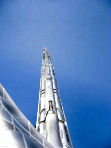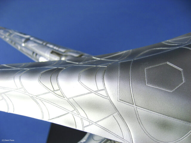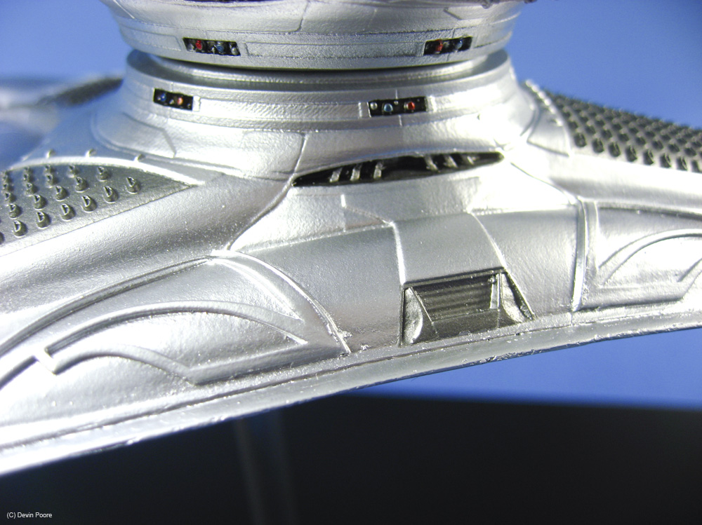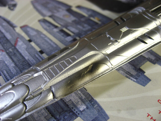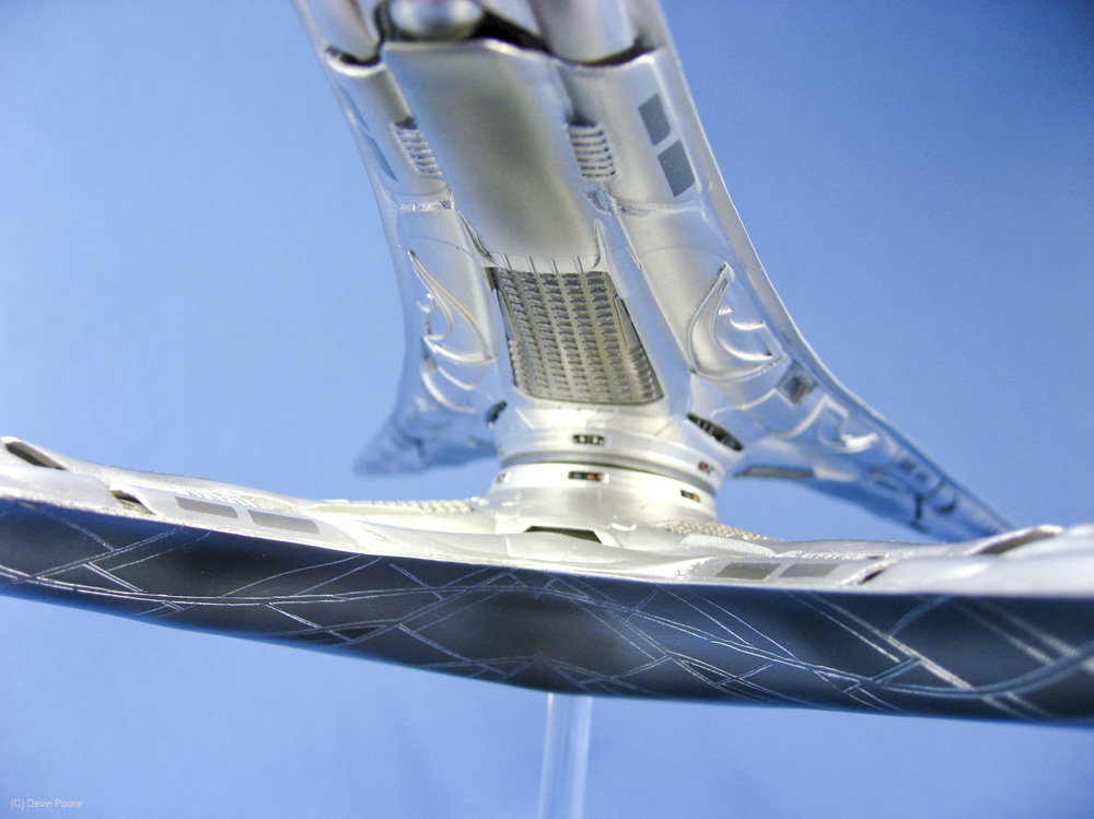 Painting presented a myriad of choices; most of these “models” that never existed in the real world tend to do that; nothing ever “existed” to replicate the paint from. I went back and forth between silver and gray for several weeks, did some test sprays, etc, and finally decided that since I painted the Cylon Raider in metallics, then it would make sense to follow suit with the Basestar. The overall coat is Tamiya Silver Leaf, over a primer coat of Mr. Surfacer. The Silver Leaf paint only comes in an aerosol rattle can,, which I decanted and shot through my airbrush (I don’t trust spray cans for fine finishes). Once that dried, I masked off panels on the outer hull and shot it with Alclad II Magnesium. I then free-handed with the airbrush various details and shades on the hull using the same Magnesium, following the scribed panel lines and hull contours.
