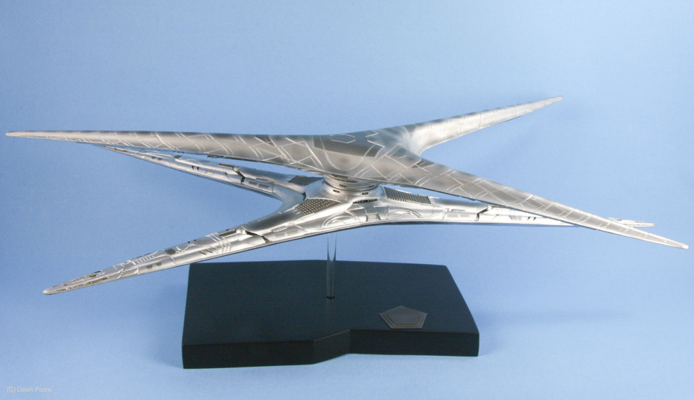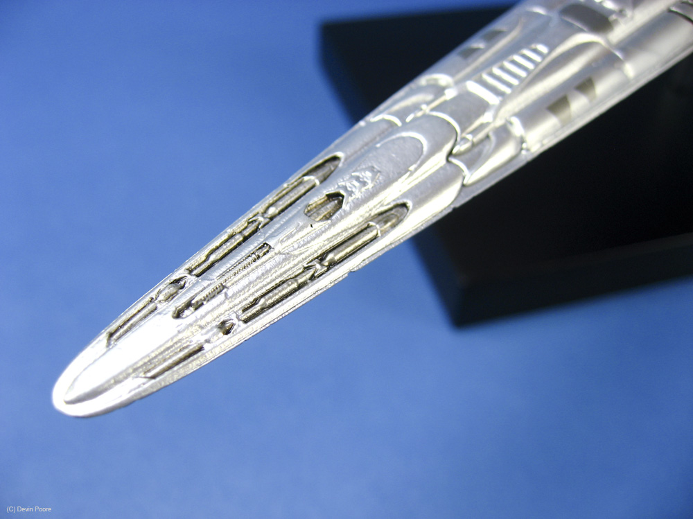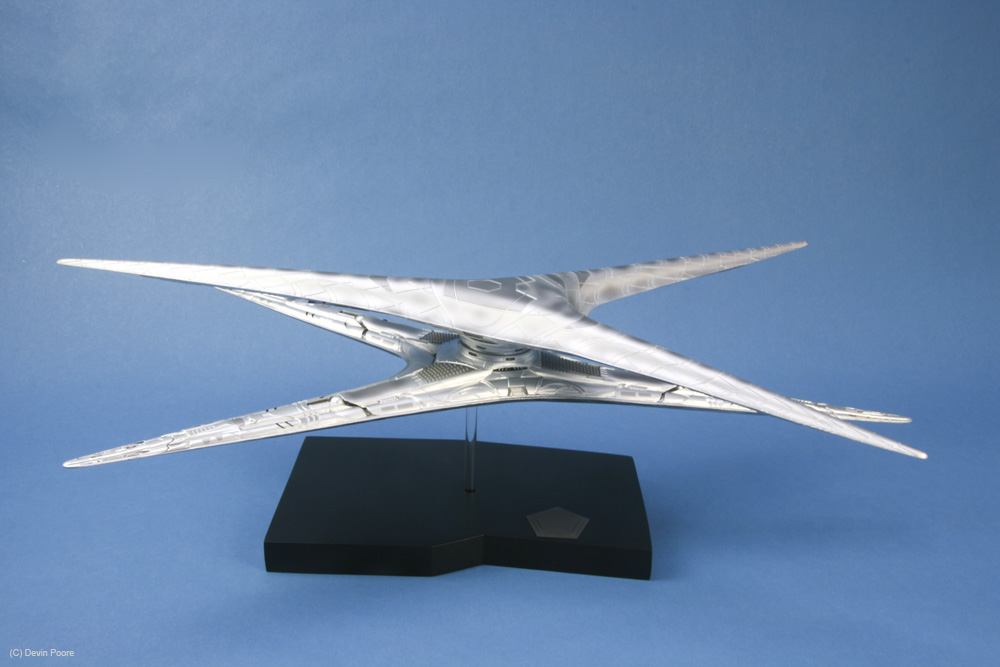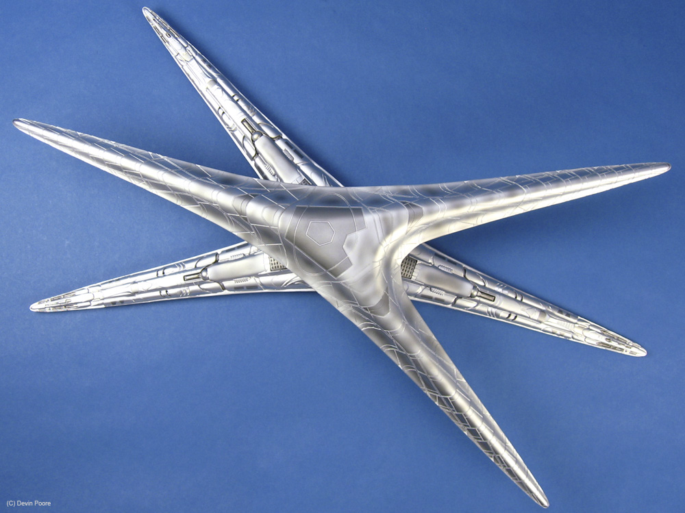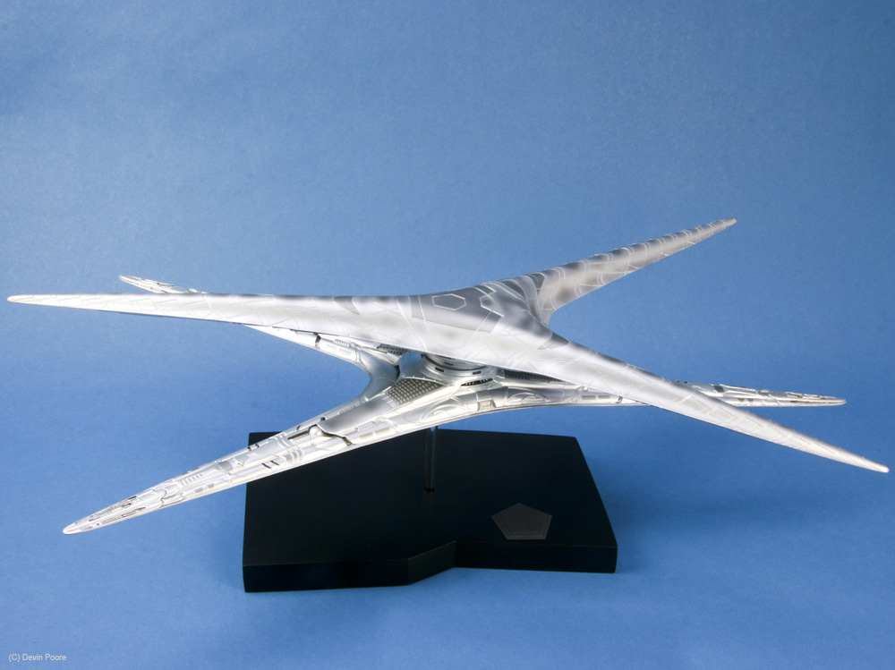 Photos were taken with my Canon 400D (Rebel Xti) and 50mm fixed lens, and also my Canon SD700IS, as it has a better macro lens. I used both my airbrush booth with backing construction paper of both black and blue as the photo studio, as well as background paper set up on our kitchen bar/island, as the Basestar is just a tad large to get good shots in the airbrush booth. Lighting is with several external daylight-corrected CFL light sources. Post-processing was done in Photoshop using a gray-card reference shot.