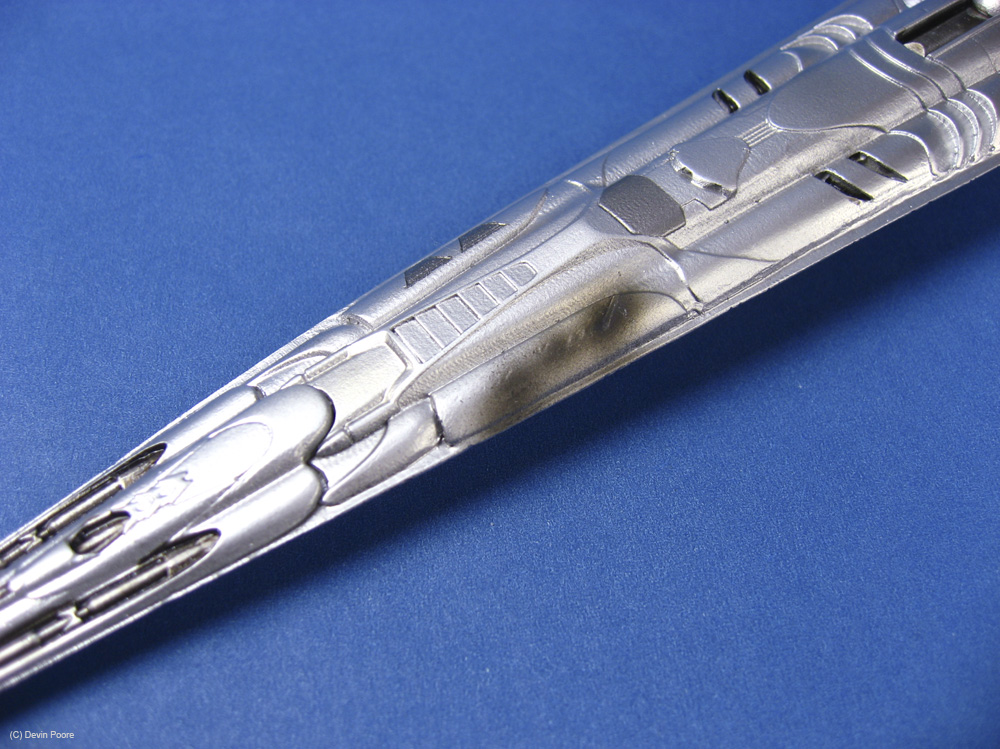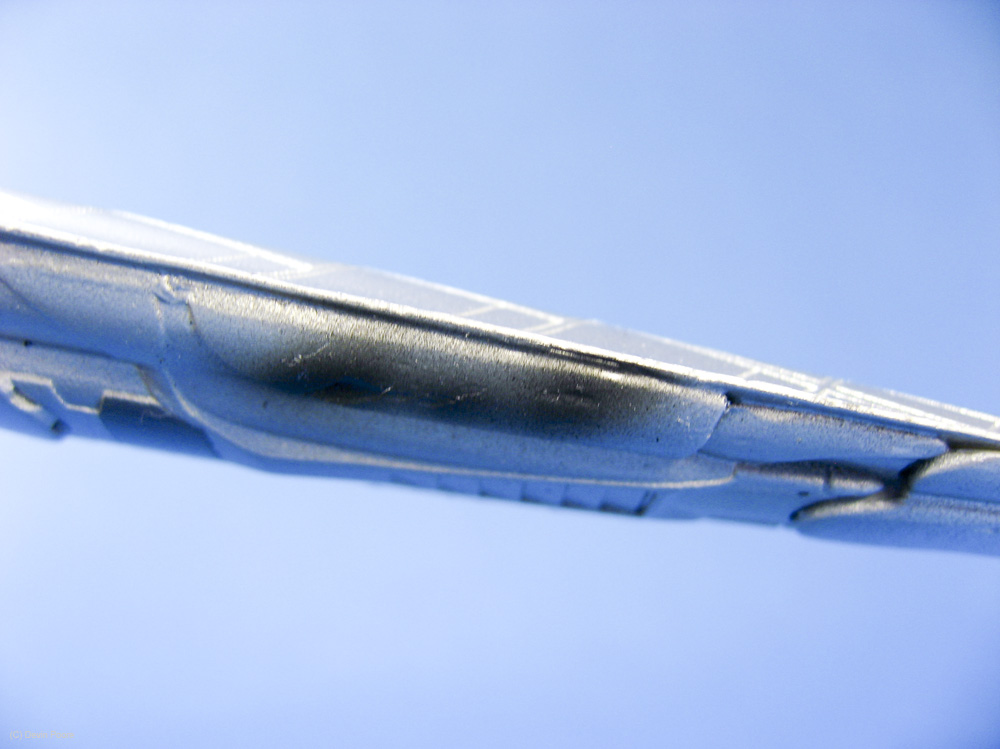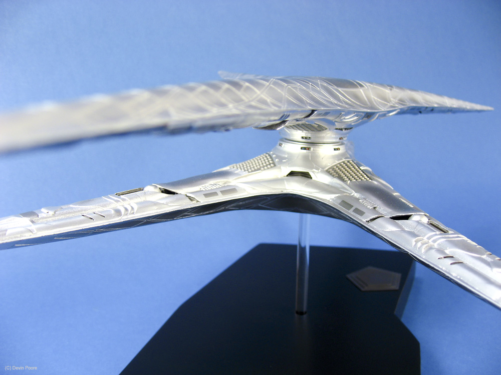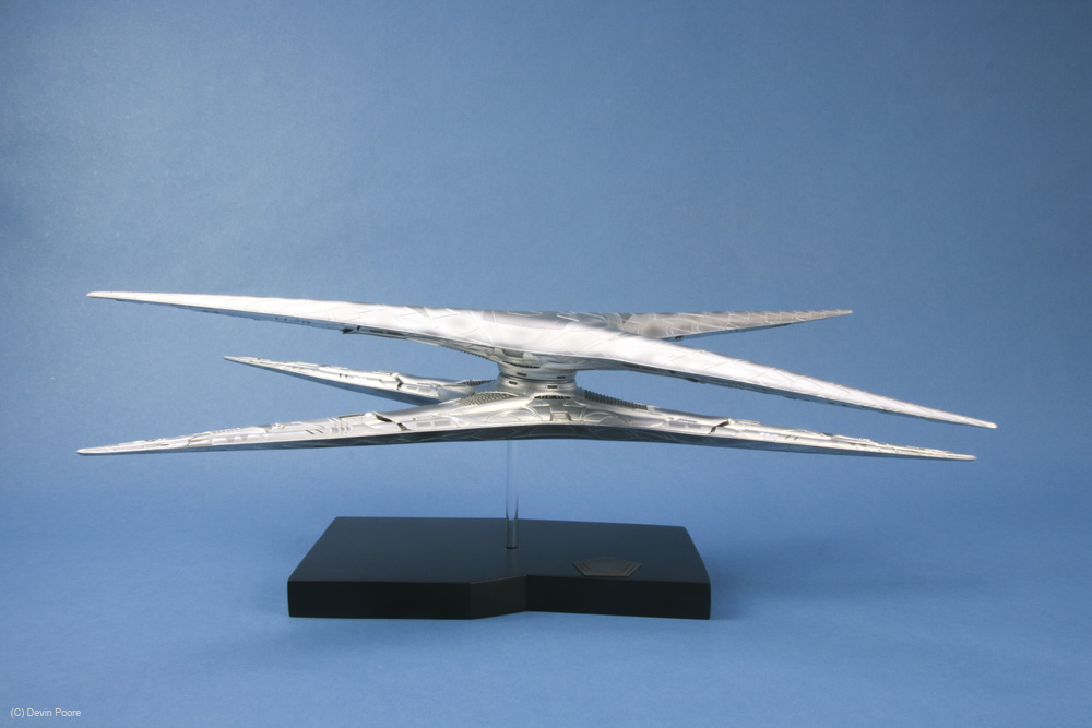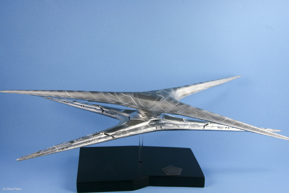 Photos were taken with my Canon 400D (Rebel Xti) and 50mm fixed lens, and also my Canon SD700IS, as it has a better macro lens. I used both my airbrush booth with backing construction paper of both black and blue as the photo studio, as well as background paper set up on our kitchen bar/island, as the Basestar is just a tad large to get good shots in the airbrush booth. Lighting is with several external daylight-corrected CFL light sources. Post-processing was done in Photoshop using a gray-card reference shot.