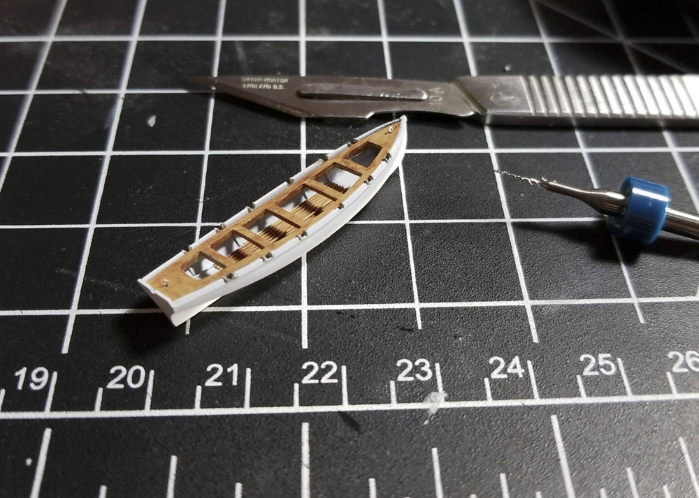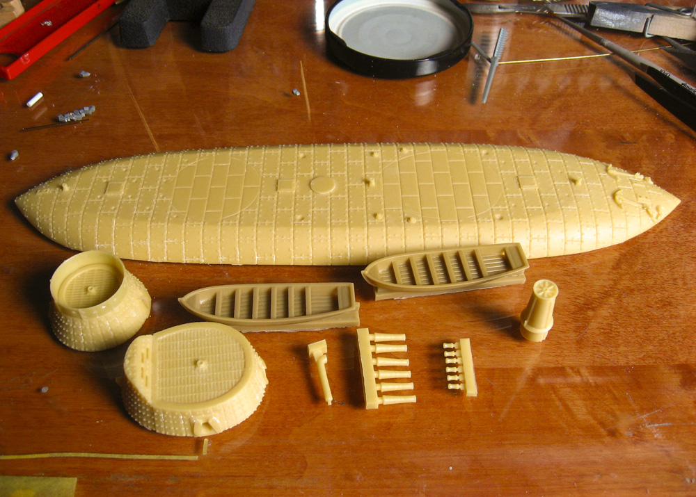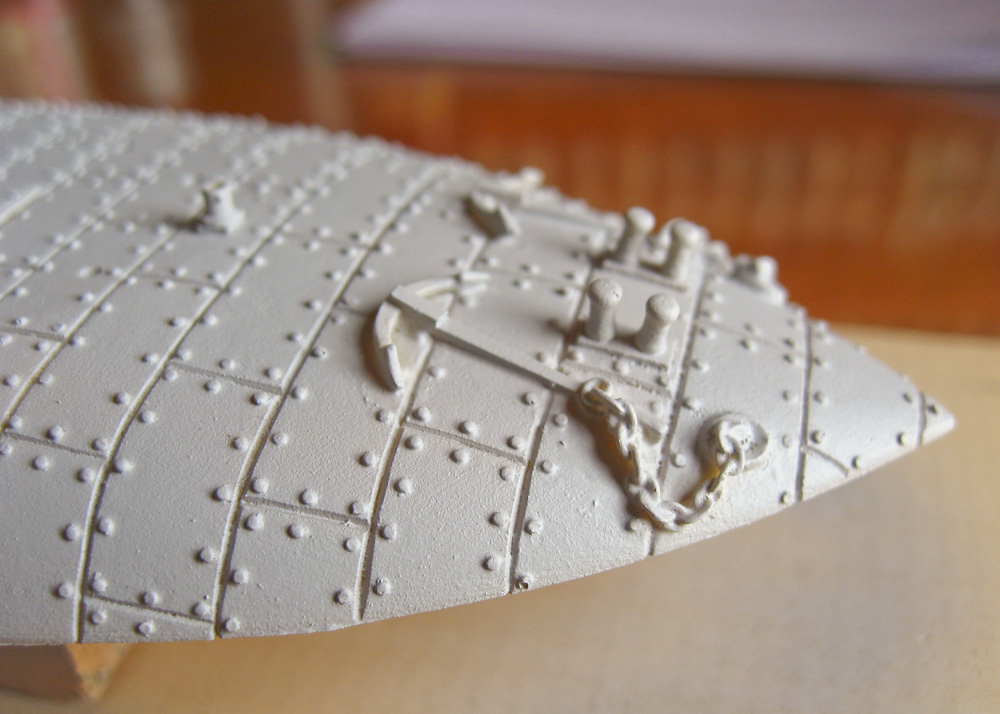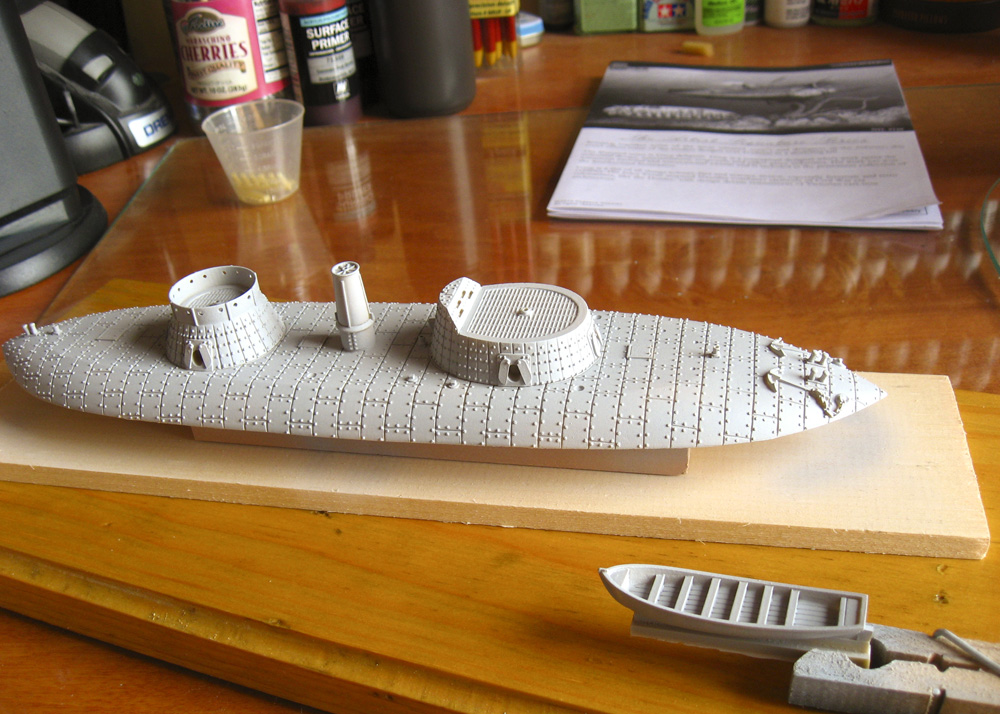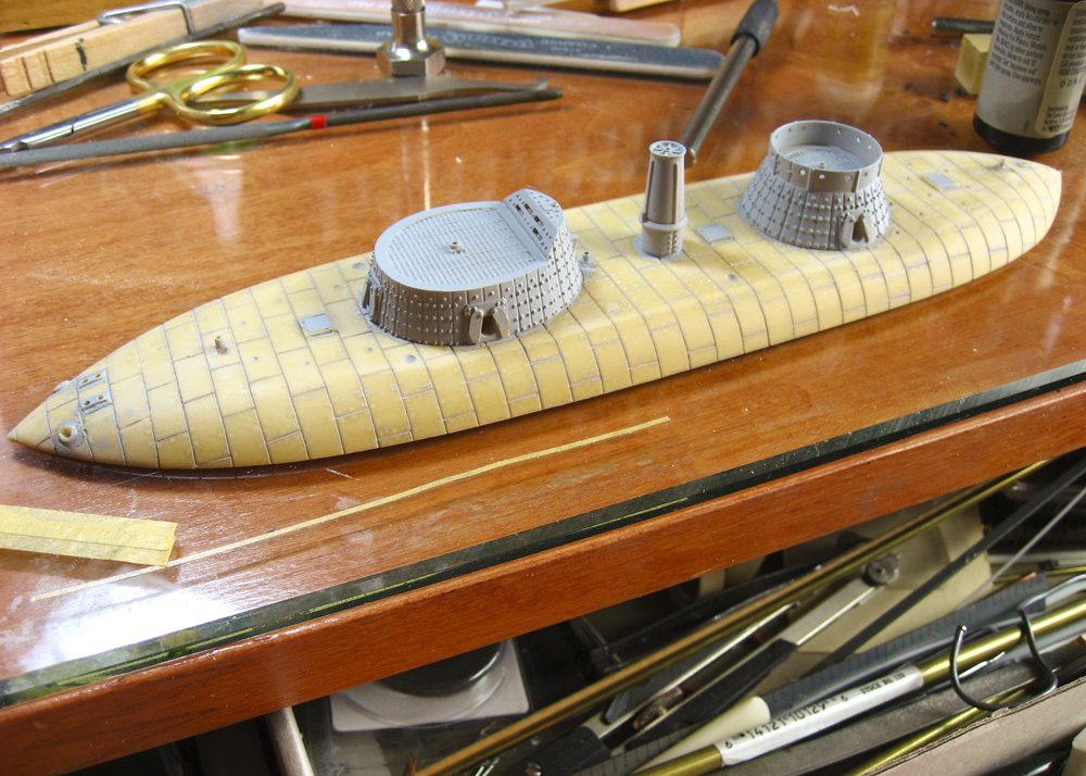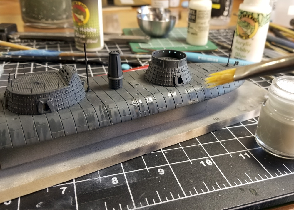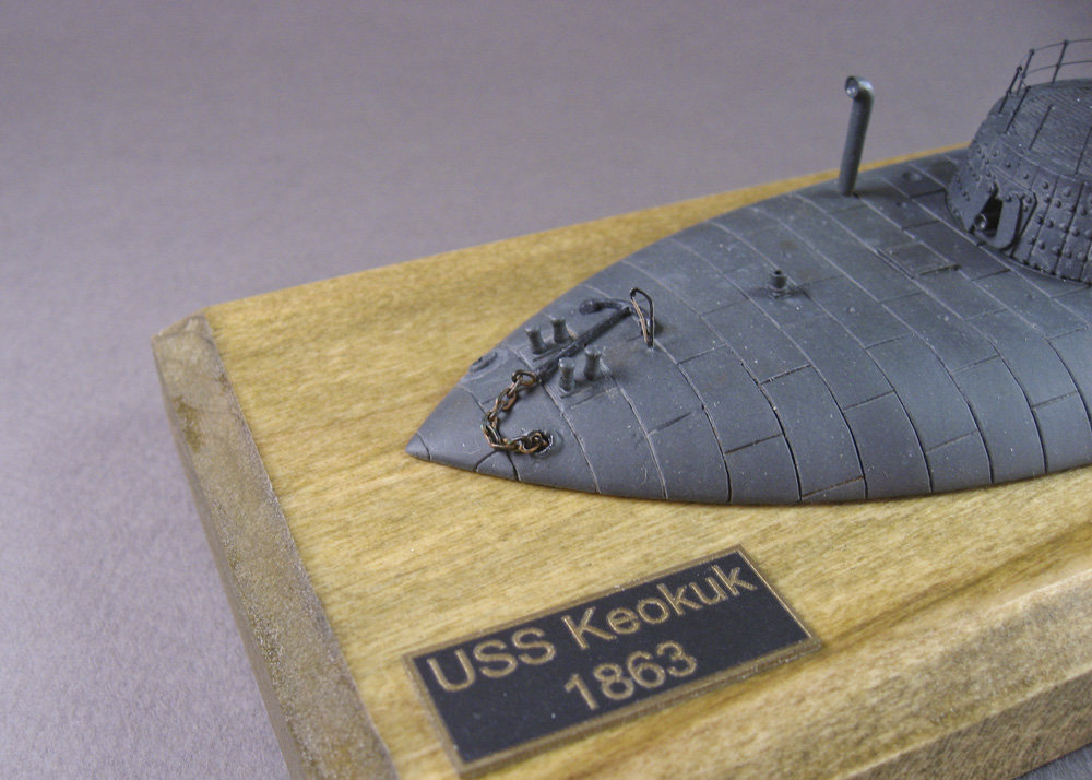 After initial assembly, that took all of 10 minutes, it became apparent that the bolts and armor seams were WAY over scale, as is often the case with ironclad kits. Keokuk’s bolts (not rivets, they didn’t rivet ironclads) were flush on her decks, so I sanded them off. I thought of using a beading tool to indicate the heads, but I wanted to keep this a more simple and quick build. I also sanded off the molded-on anchor chain and anchors at this point; they were fine, but their removal made sanding the rest of the hull easier, and separate chain and anchors just look better.