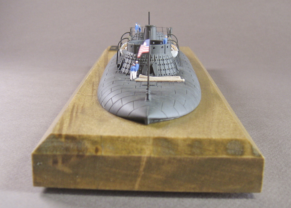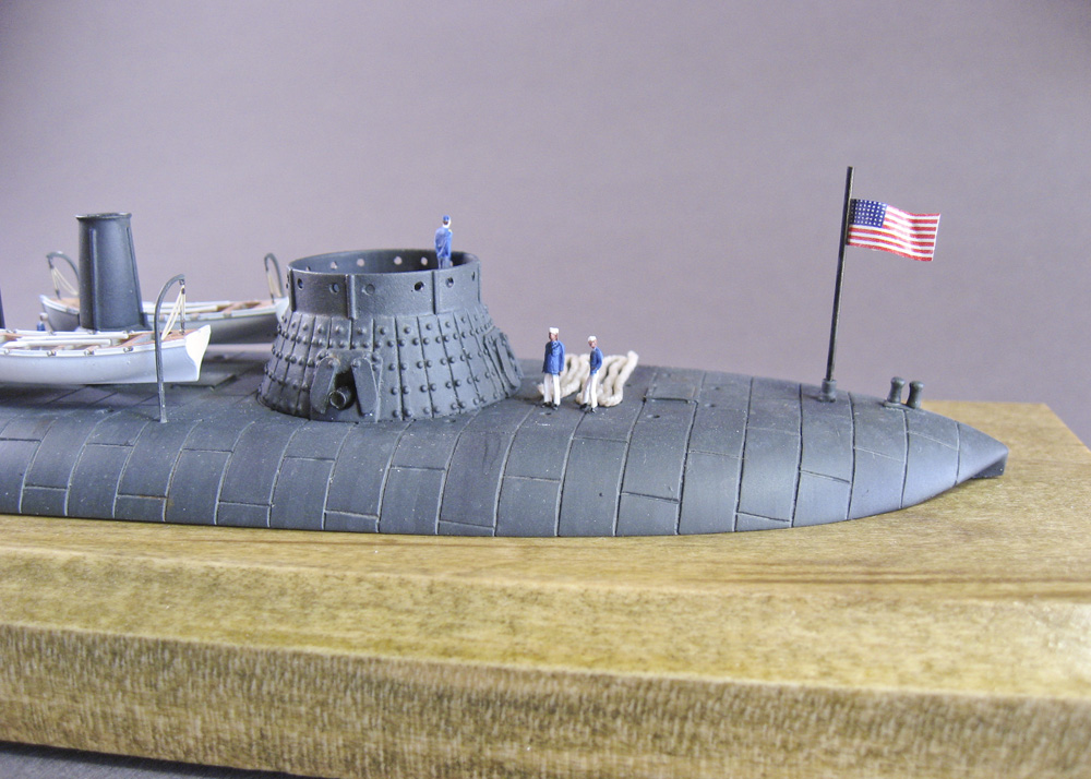 Final details were straight forward. The CMK boats build up very nicely. The Flagship Models railings likewise are easy to work with, but I used clear monofilament plastic thread for the lines between them; they don’t flex much, so they look more like metal bars than hemp ropes. Oh well. I snagged the flag out of a bag of extra decals I have on-hand (don’t count the stars on it). The figures are brush painted with Vallejo Model Color, again; I made an attempt to add Black crew members to Keokuk — Blacks served widely on Union warships during the conflict — but my skin tones don’t look right in the photos, so I may retouch them. The base is a scrap of poplar that I had lying about, and as previously stated, I laser cut the nameplate out of acrylic.