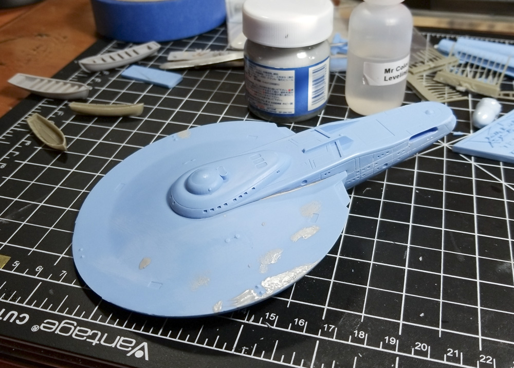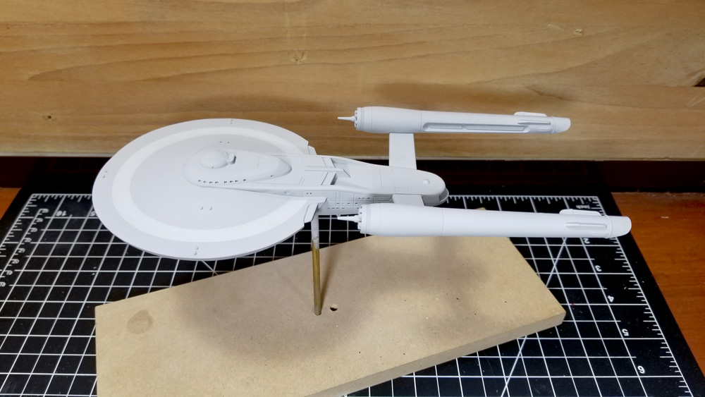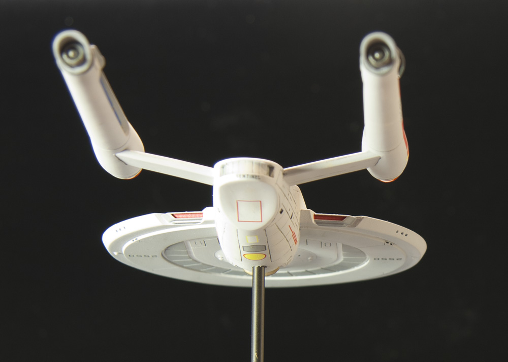 I picked this kit up from the UGH! table in the vendor room at Wonderfest in 2018. I was really impressed with the fit of the parts right out of the box. There were some issues, mostly with printing artifacts of the 3D master that hadn’t been sanded smooth before the resin molds were made, but light surface work with sandpaper resolved most of this. During sanding and handling, a couple of phaser emplacements either broke off or revealed voids beneath, so I drilled out those locations on the upper hull and replaced them with tiny glass beads. The Bussard collectors on the front of the warp engines came as vacuum formed clear plastic over resin forms, which when cut away mated with the engines very nicely.
