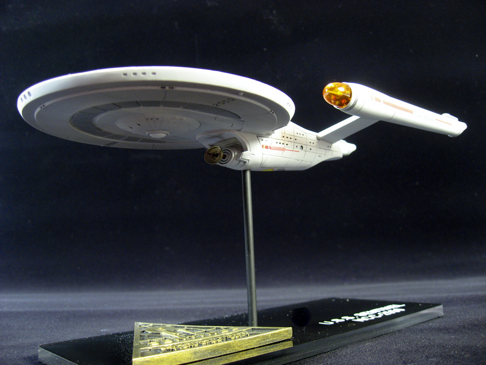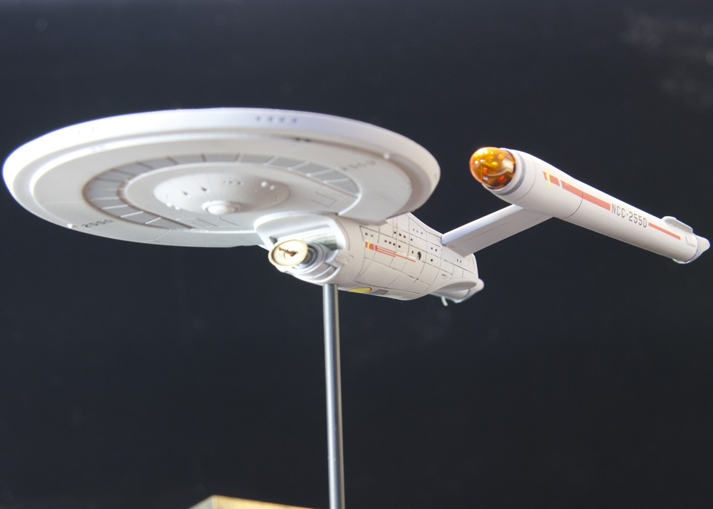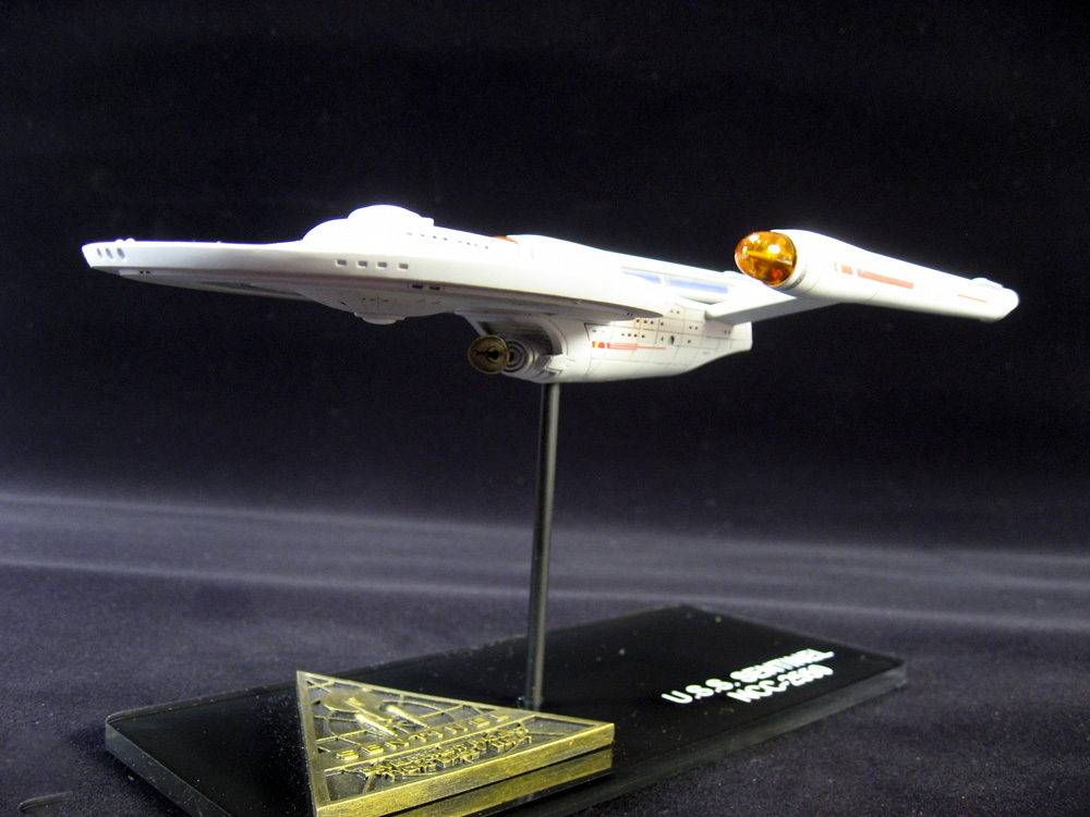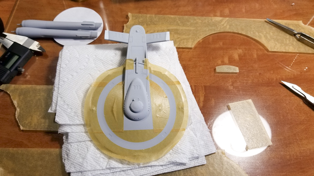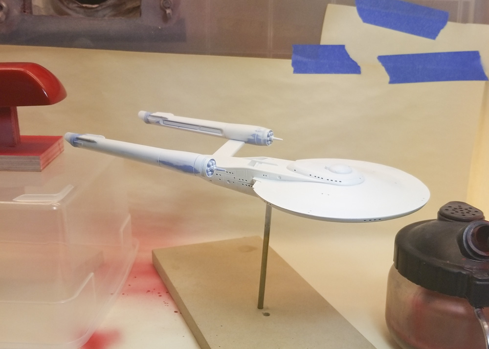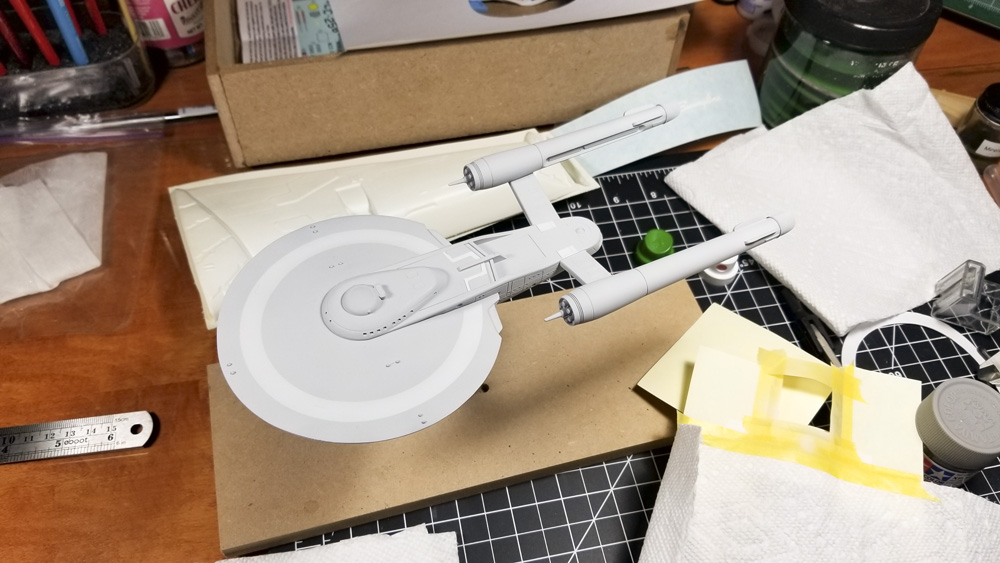 Paint was straight-forward. I made the custom mixes based upon some descriptions I found online, and tweaked them to my liking. The biggest challenge was the light gray circle that runs around the upper hull, which I cut from masking tape using an odd circle cutter I picked up from Starship Modeler years ago (it’s long since out of production).