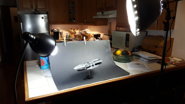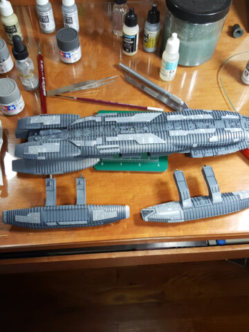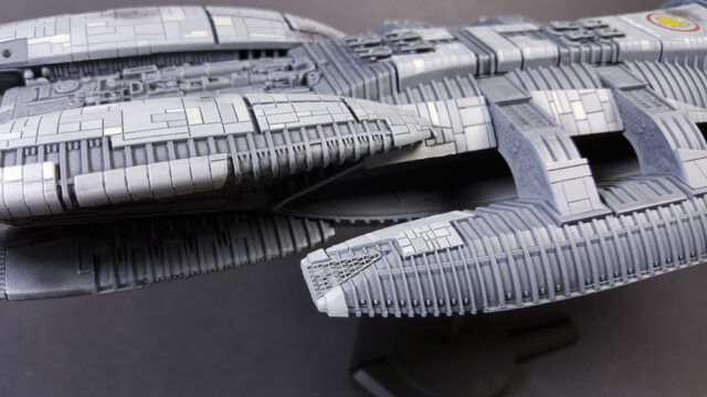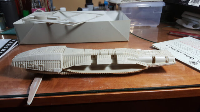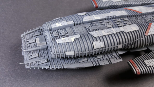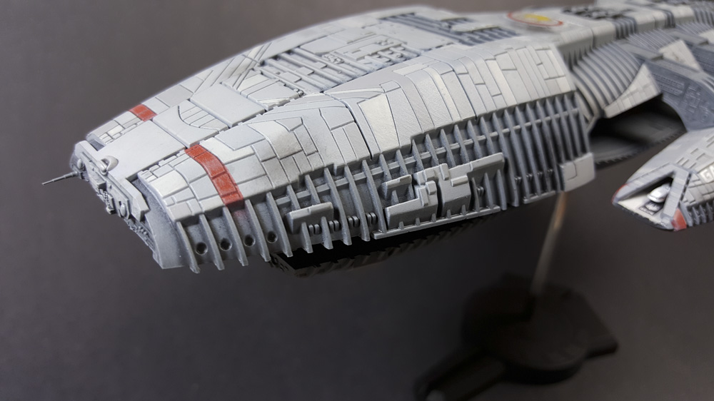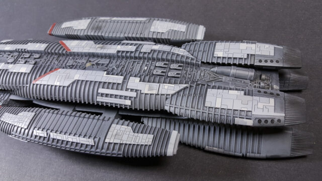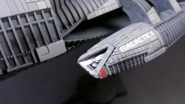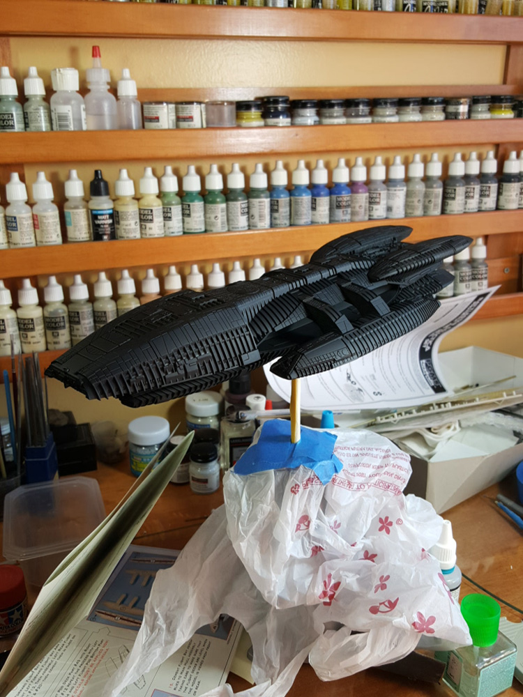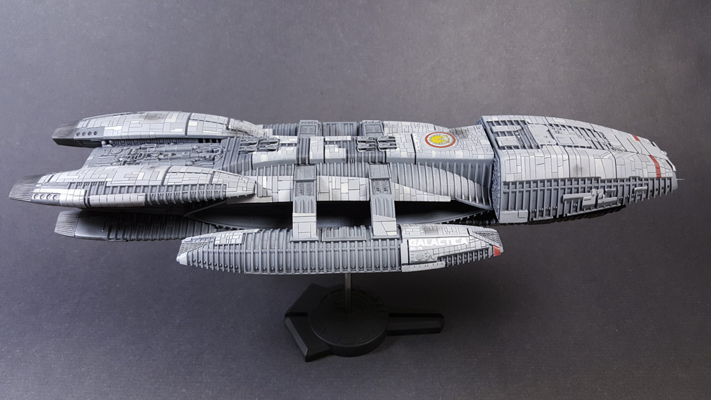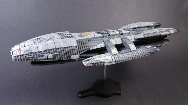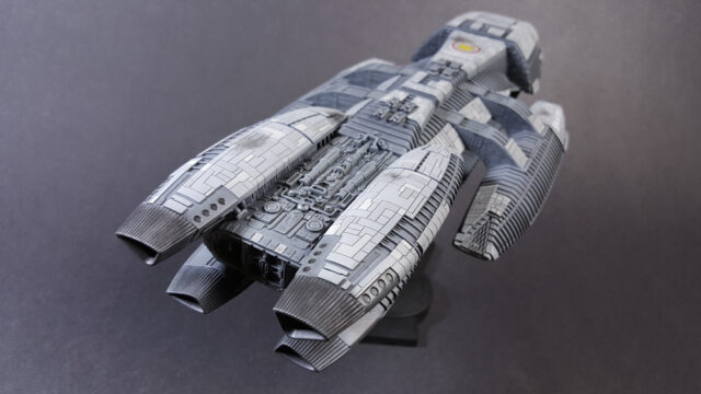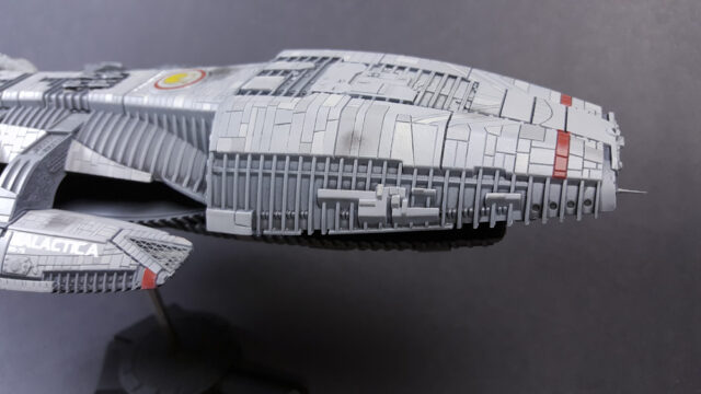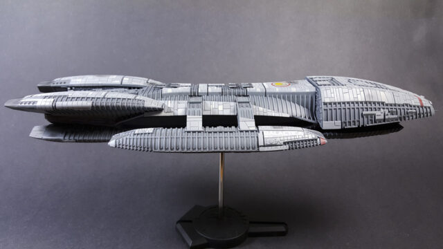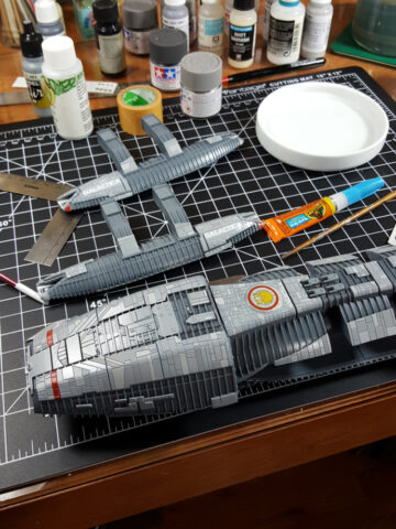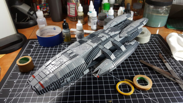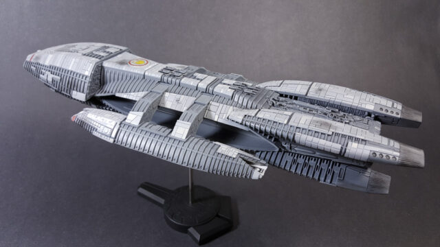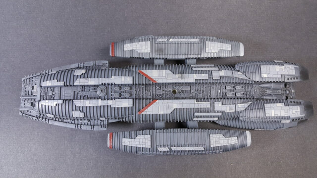 Another one from the rebooted (and better) Battlestar Galactica from the early 21st century. The title ship, as a matter of fact, in 1/4105 scale, styrene, by Moebius Models. This was a fairly straight-forward build that went a little longer than expected, mostly because I tried a few new things, some that worked, some that didn’t.
