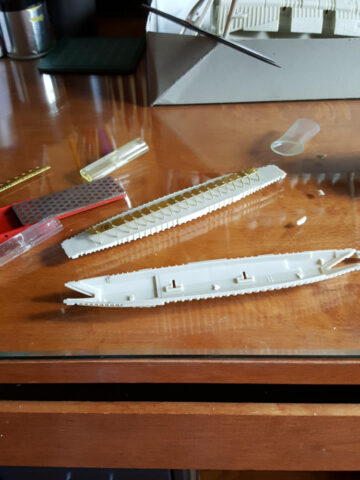 For extras and aftermarket, besides the aforementioned hangar interiors, I also used photo-etch “windows” from the same set for openings on the starboard hangar pod. I also purchased some gun turret bases from Aptivaboy on Shapeways (the same kind soul that helped me with the Valkyrie build). The bow antenna came from telescoping brass tubing. The shuttles in the hangar were picked up at JerseyFest a couple of years ago.