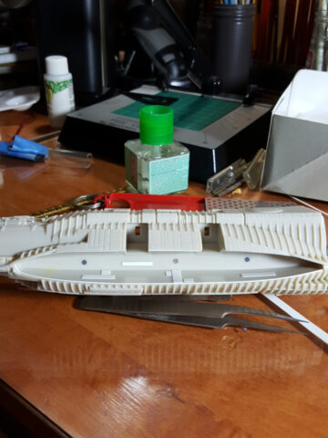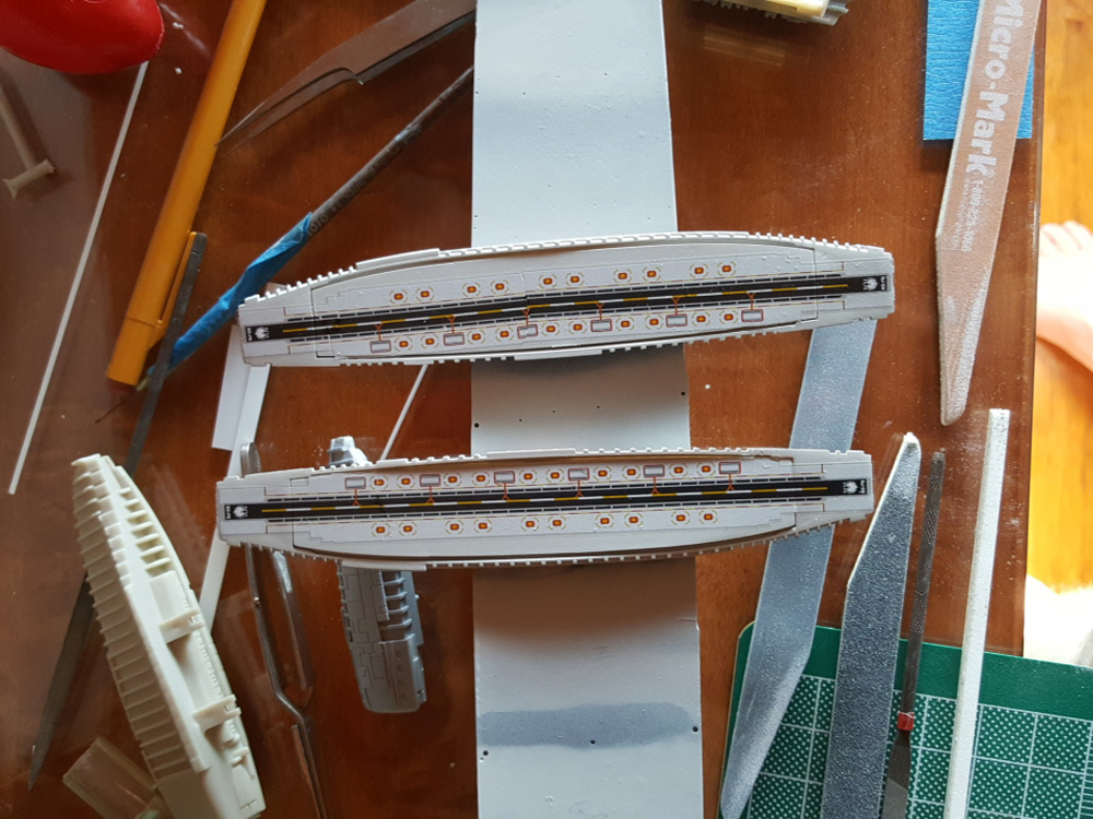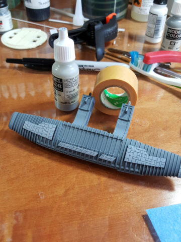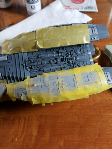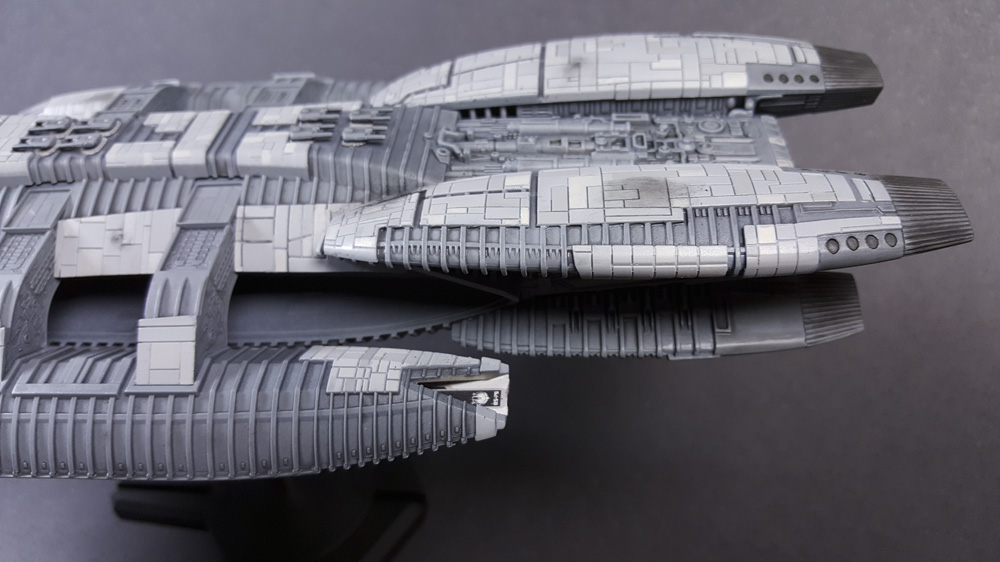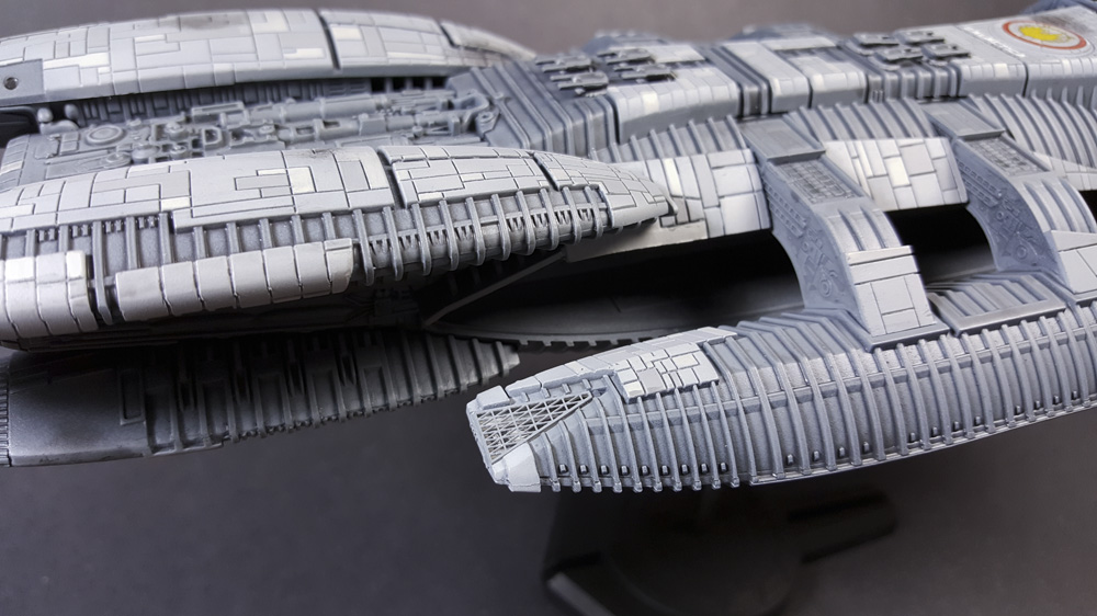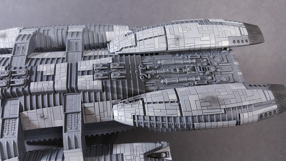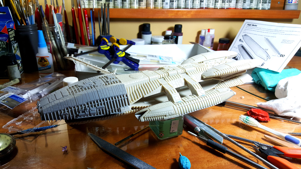 Construction is straight-forward and fairly simple. I ran into some fit issues with the hangar pods, mostly because of the photo-etched inserts that I installed. Not sure if I installed them correctly or not, but the pods didn’t line up as I’d have liked, necessitating a lot of sanding between raised ribs. In future builds I’d simply not put in the pod interiors, as you can’t see them anyway unless you’re lighting the thing. Other than that, building was straight forward with a little filling and sanding needed here and there.