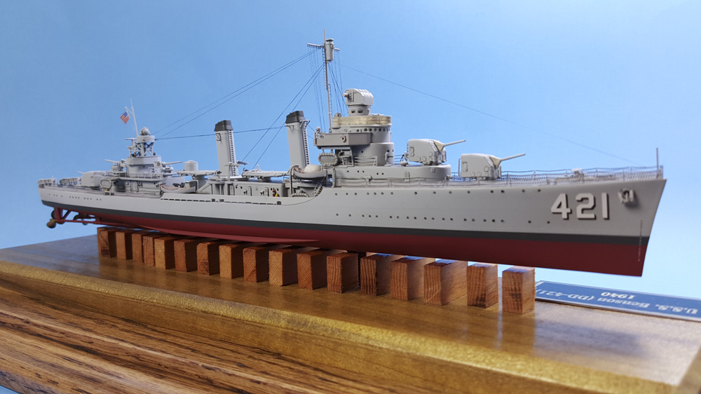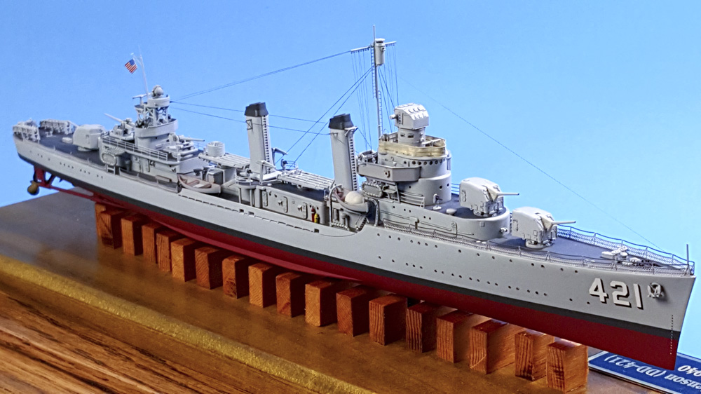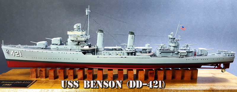 USS Benson (DD-421) was laid down in May 1938, launched in November of the following year, and commissioned in July of 1940. The lead ship of the glass that would bear the brunt of the fighting in the opening years of WWII in the Pacific and Atlantic, she served most of her time in the Atlantic and Mediterranean theaters. Due to a collision with the destroyer Trippe, and subsequent repairs, she missed the Allied invasion of North Africa, Operation Torch, in 1942. Afterwards, she spent most of her time escorting convoys around the Mediterranean. She provided support for the invasion of Sicily in July 1944, and the invasion of Southern France in August of 1944. She returned to the United States in January of 1945 for refit, then was reassigned to the Pacific theater, arriving at Pearl Harbor in May of that year.