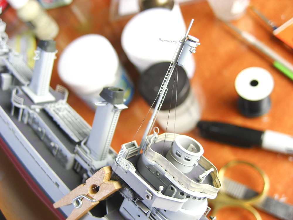 I primed the ship in Mr. Surfacer lacquer, and then went with acrylics for everything else. Gloss coat for weathering was done with Future floor wax, and the final dullcoat was applied using Golden Varnishes’ Polymer Varnish with UVLS. The base is from Grandpa’s Cabinets, and one of the nicest pieces of display work I’ve ever seen. Rigging was done with two mediums: Flag halyards were rigged with Caenis fishing line, while the standing rigging was done with individual strands of EZ-Line.